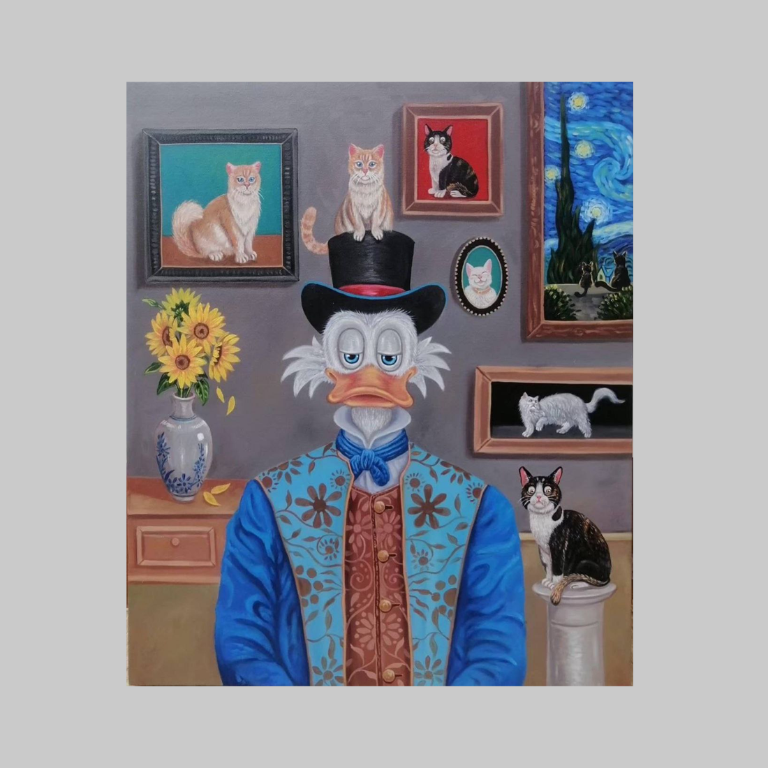 “이 그림은 스크루지 맥덕(Scrooge McDuck)을 작가 자신으로 장난스럽게 재해석하며, 그가 반 고흐의 걸작들을 열정적으로 재창조하는 모습을 묘사합니다. ‘별이 빛나는 밤’이나 ‘아를의 침실’과 같은 친숙한 장면들이 벽에 걸려 있으며, 각각 맥덕의 기발한 시각을 통해 재해석되었습니다. 이러한 유머러스한 비틀기를 통해, 이 작품은 순수한 창조의 기쁨을 찬양하며, 존경심과 예술적 재창조 사이의 경계를 모호하게 합니다.”