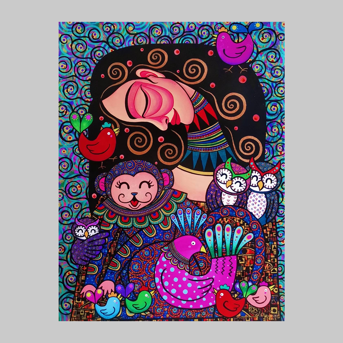 920 / 5,000 예술가 차야니사 스리위차난(Chayanisa Sriwichainan)의 ‘원숭이 해’는 강렬하고 장식적인 패턴을 사용하여 원숭이 해가 상징하는 기쁨, 장난기, 그리고 활기찬 활력을 표현합니다. 캔버스 중앙에는 눈을 감고 행복한 미소를 짓고 있는 여성이 고요히 앉아 있습니다. 그녀의 몸과 배경은 소용돌이치는 나선형과 복잡한 기하학적 모티브로 가득 차 있습니다. 여성은 올빼미와 새를 포함한 다양한 동물들에게 둘러싸여 행복하게 웃는 커다란 원숭이를 품고 있습니다. 원숭이와 여성의 옷은 클림트의 스타일을 연상시키는 정교한 장식 패턴으로 뒤덮여 있습니다. 이 작품은 원숭이띠의 재치와 활기찬 면모를 강조하며, 인간, 동물, 그리고 자연의 패턴이 어떻게 어우러져 복잡하면서도 조화로운 세계를 만들어내는지 시각적으로 보여줍니다. 여성의 고요한 표정은 세상의 혼돈 속에서도 유머와 순수한 즐거움을 통해 찾는 행복을 상징합니다.