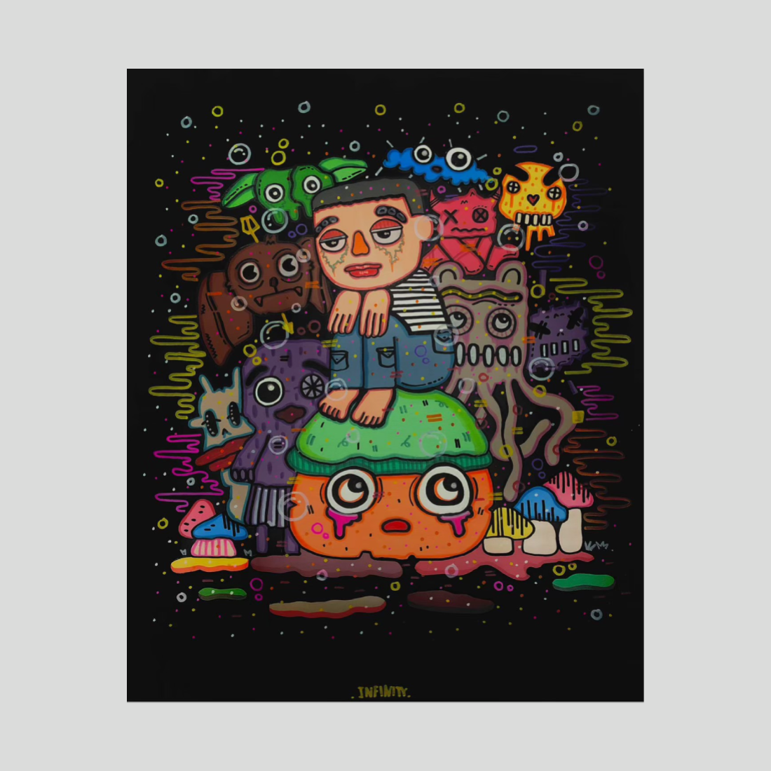 노이 인피니티, 아크릴 온 캔버스. 눈물 맺힌 주황 생명체 위에 소년이 무릎을 안고 앉았다. 형광 괴물들이 근심과 농담처럼 맴돌며 어둠을 축제로 바꾼다.