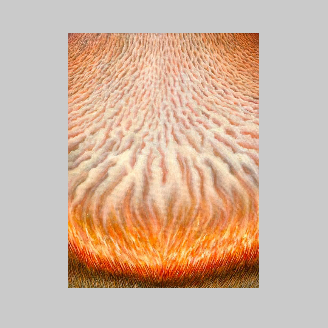 “부리치 파쿰(Bhurich Fahkoom) 작가의 ‘Merged Wave(합쳐진 물결)’는 털과 피부 질감을 극사실적으로 묘사하여 에너지의 흐름과 자연의 역동적인 힘을 포착하는 추상적 구상 작품입니다. 캔버스는 상단의 피부 또는 부드러운 모래 언덕과 유사한 부드러운 질감과 하단의 조밀한 갈색 털이 만나는 지점에 초점을 맞춥니다.” “중앙 부분의 붉은색과 주황색을 띠는 물결은 마치 타오르는 불꽃이나 격렬하게 솟아오르는 물처럼 보이며, 살아있는 주체 내부에서 발산되는 강렬한 생명력이나 잠재된 감정을 시각적으로 구현합니다. 이처럼 유기적으로 융합되는 질감의 물결을 통해, 작품은 개별적인 실체가 아닌 자연과 살아있는 존재들의 통합된 에너지를 숭고하게 표현합니다.”