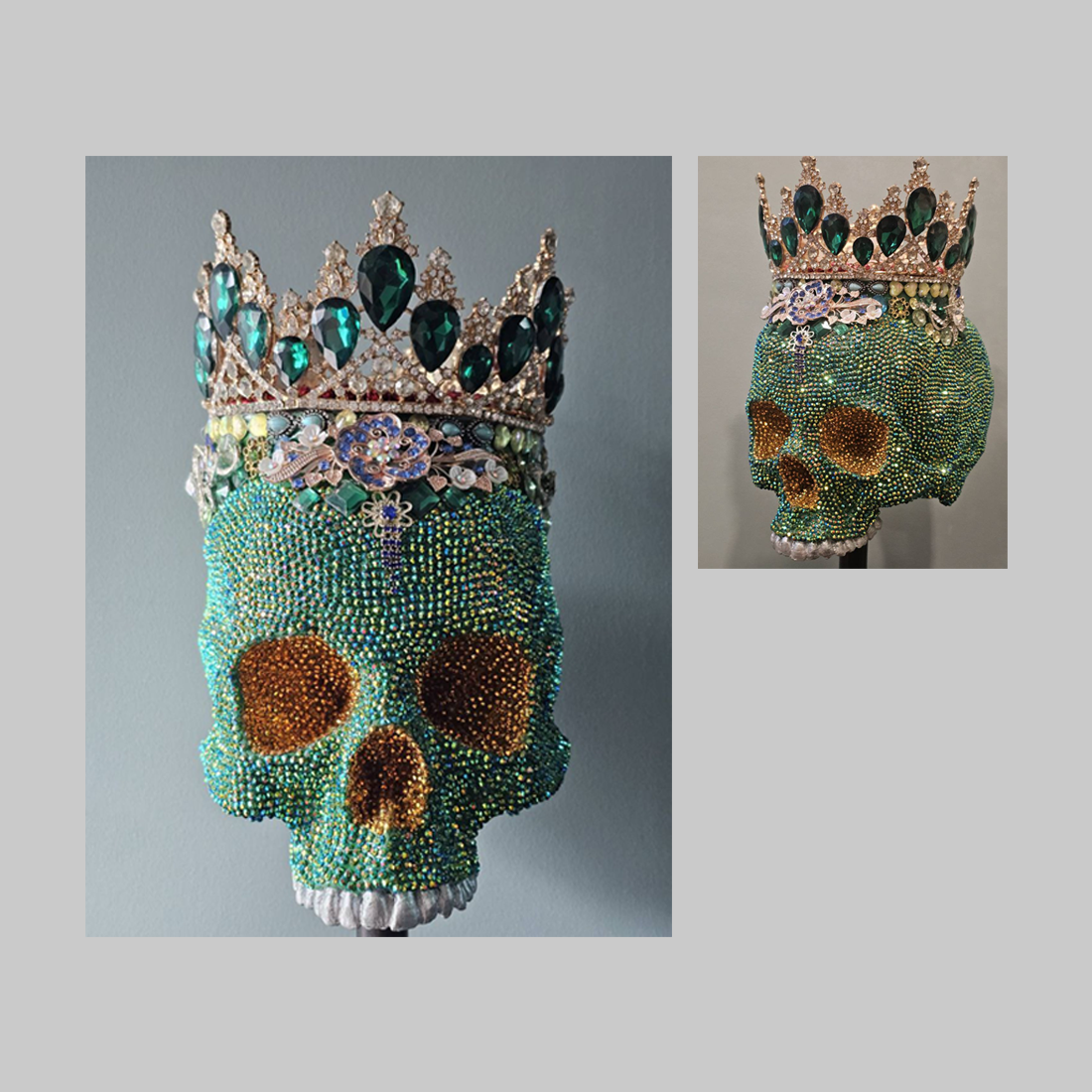 작가 **Pongsatorn Tipasatien (퐁사톤 띠빠사띠엔)**의 ‘삶의 아름다움 No:20’는 죽음의 보편성을 가장 호화롭고 장엄하게 장식함으로써 삶의 덧없음과 영원한 아름다움 사이의 긴장감을 탐구합니다. 이 해골 조각은 미세한 청록색 및 녹색 구슬로 완전히 덮여 있어 귀금속처럼 반짝이는 질감을 만듭니다. 눈구멍은 금색 또는 호박색(앰버)의 구슬로 가득 채워져 관람객의 시선을 강렬하게 끌어당깁니다. 커다란 에메랄드색 보석이 박힌 화려한 왕관이 해골 위에 놓여, 해골이 상징하는 필멸성(죽을 수밖에 없음)과 왕관이 상징하는 힘 및 영속성을 대조시킵니다. 이 작품은 피할 수 없는 죽음의 현실에 호화로운 장식을 더함으로써, 인간이 덧없는 본성에도 불구하고 추구하는 가치와 존엄성을 은유적으로 표현하며, 제목인 **’삶의 아름다움’**에 대한 심오한 성찰을 유도합니다.