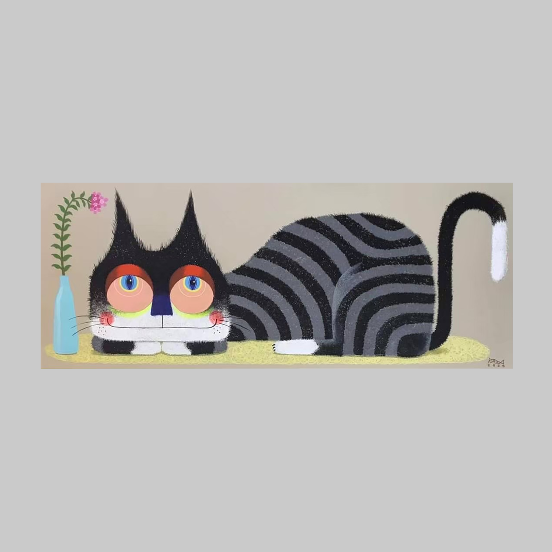 고양이의 크고 둥근 눈, 검은 털, 그리고 과장된 줄무늬 몸체는 기묘한 긴장감을 조성합니다. 그 옆에 놓인 작은 꽃병은 고양이의 지배적인 시선을 더욱 강조합니다. 이 작품은 순간을 관찰하는 끈질긴 응시와 고양이 특유의 고집을 상징합니다.