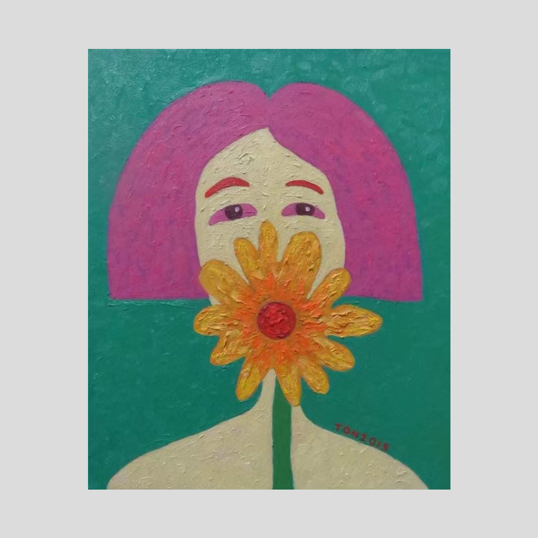 짙은 청록색 배경을 바탕으로 보라색 단발머리를 한 인물이 커다랗고 질감이 풍부한 주황색 꽃을 얼굴 바로 앞에 들고 있습니다. 꽃은 마치 가면처럼 코와 입을 가리고 있어, 오직 눈만이 관람객을 응시하게 합니다. 이는 수줍음, 비밀스러움, 또는 자연과의 깊은 교감을 불러일으킵니다. 보라색 머리카락, 초록색 배경, 그리고 밝은 주황색 꽃 사이의 색채 대비가 매우 인상적입니다. 임파스토 기법으로 표현된 꽃잎은 캔버스 밖으로 튀어나올 듯 입체적이며, 이 흥미로운 구성의 중심점 역할을 합니다.