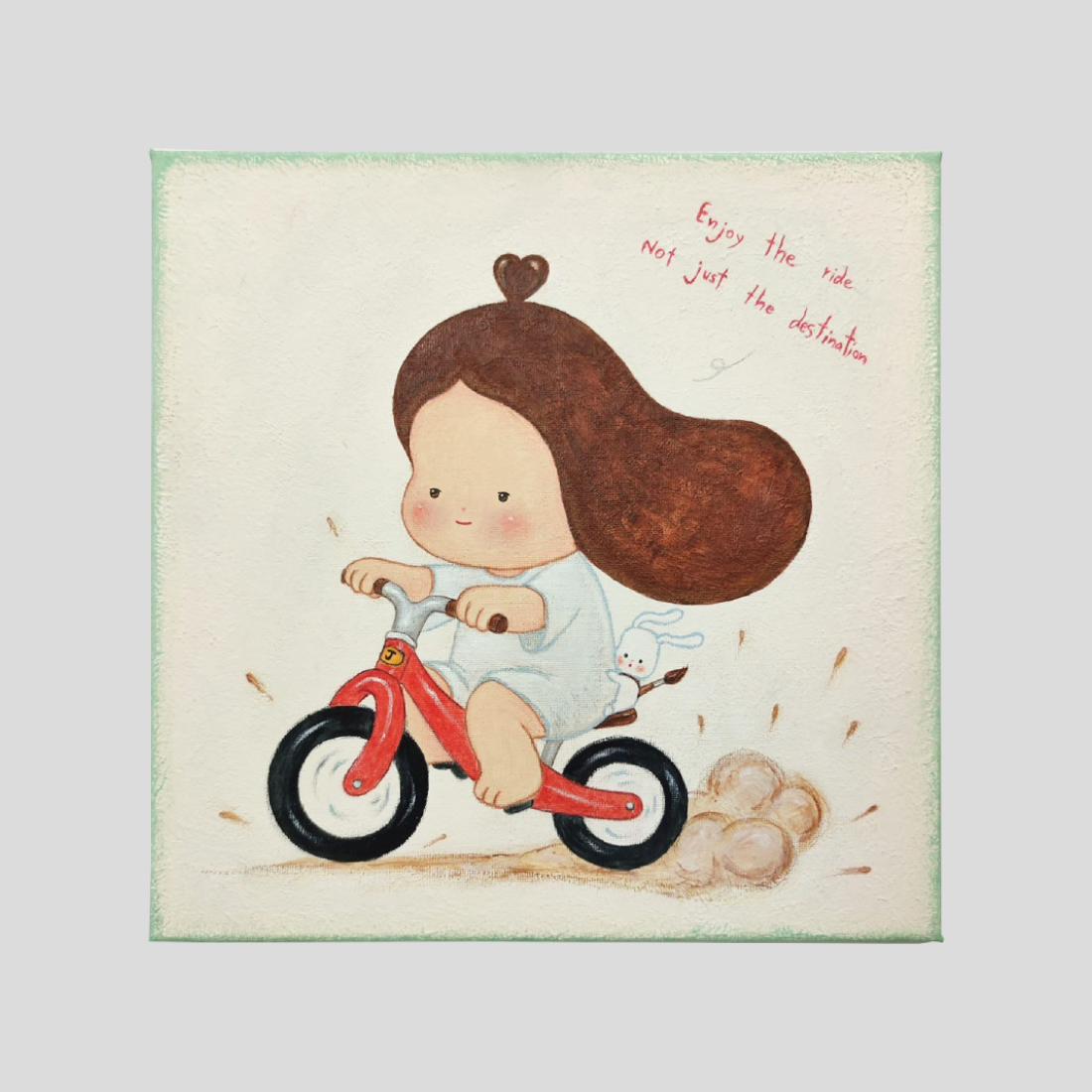 Jiro Jiro 작가의 이 작품은 어린 시절의 순수함과 여정의 기쁨을 담고 있습니다. 캔버스 위에 아크릴, 오일 파스텔, 색연필을 혼합하여 따뜻한 질감을 살렸으며, 빨간 자전거를 탄 귀여운 소녀와 작은 토끼 친구를 사랑스럽게 묘사했습니다. 바퀴 뒤로 일어나는 흙먼지는 역동성을 더하며, “목적지뿐만 아니라 그 과정도 즐기세요”라는 문구는 보는 이에게 삶의 여정을 소중히 여기라는 메시지를 전합니다. 동화 같은 분위기와 부드러운 색감이 어우러져 마음의 평안을 선사하는 매력적인 작품입니다.