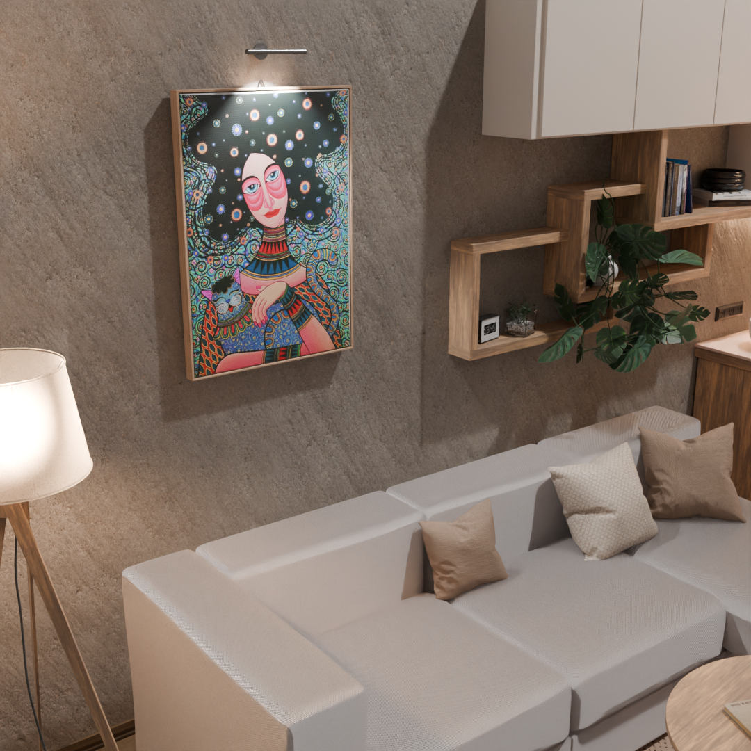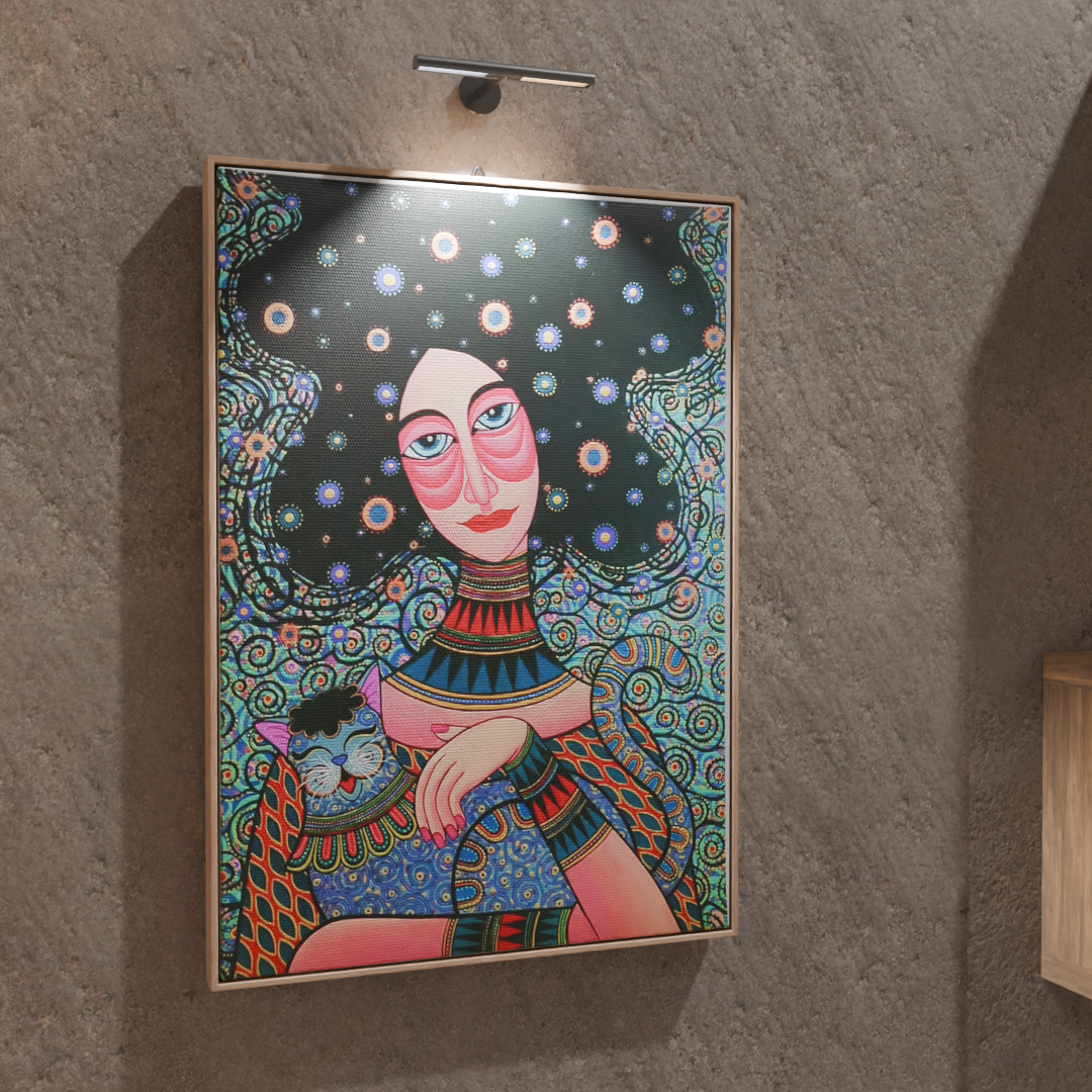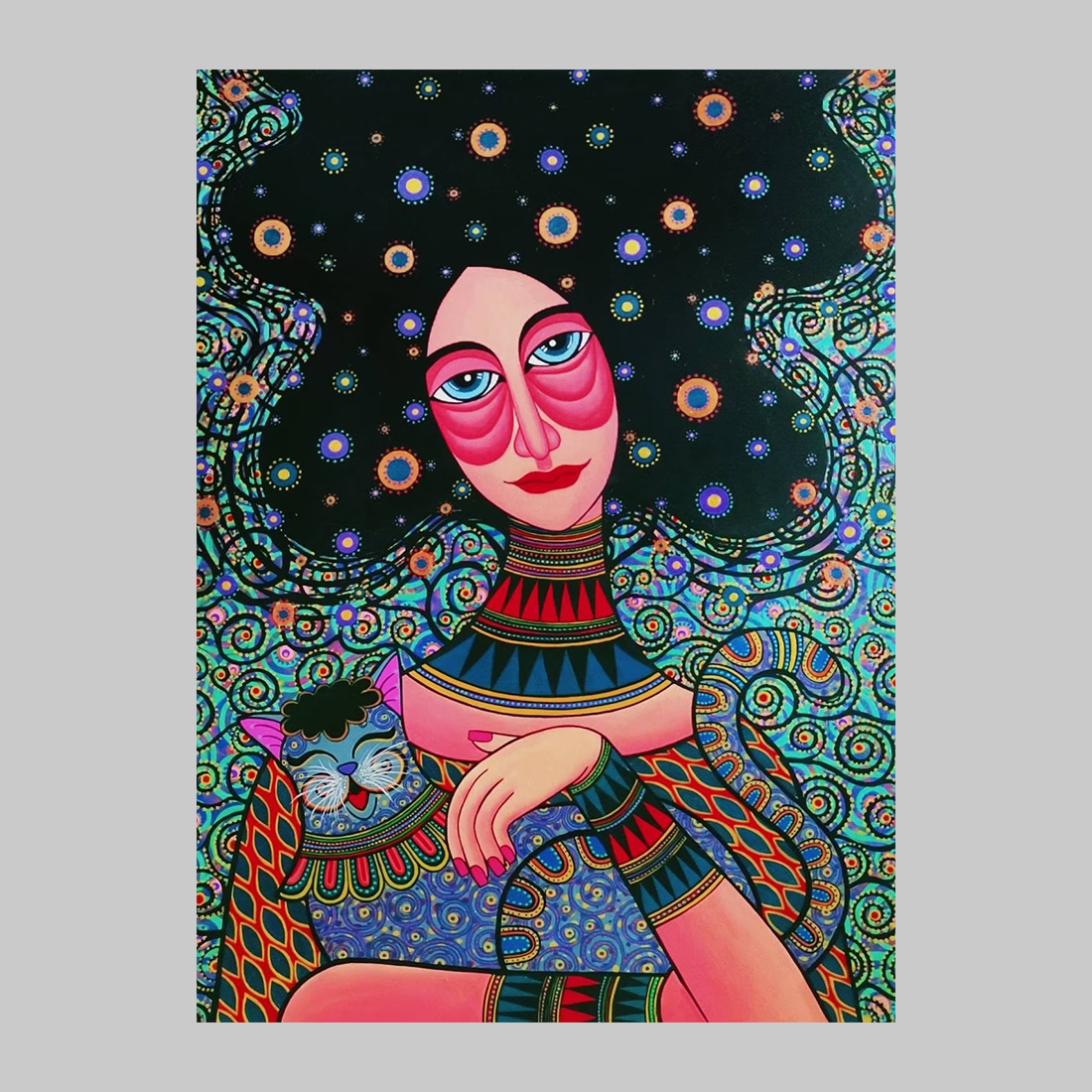 예술가 차야니사 스리위차난(Chayanisa Sriwichainan)의 ‘진정한 행복 #3’은 강렬한 패턴과 색채를 통해 내면의 평화와 반려동물과의 유대감에서 비롯되는 진정한 행복을 표현합니다. 캔버스 중앙에는 분홍빛 피부를 가진 여성이 커다란 푸른 눈과 붉은 뺨으로 시선을 사로잡습니다. 그녀는 생동감 넘치는 모티프로 장식된 옷을 입고 있으며, 목과 어깨의 패턴은 클림트의 장식 예술을 떠올리게 합니다. 그녀의 품에는 편안함과 만족감을 표현하는 푸른 고양이가 안겨 있습니다. 차갑지만 깊은 눈빛과 배경의 현란하고 정교한 나선형 패턴은 세상의 복잡함과 대조를 이룹니다. 고양이를 껴안는 그녀의 따뜻한 몸짓은 진정한 행복이 외적인 화려함이 아닌 가장 은밀한 곳에서의 무조건적인 사랑과 연결에서 비롯됨을 강조합니다.