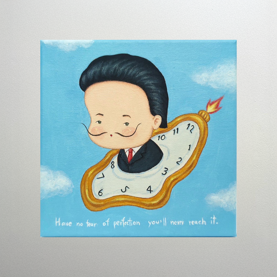 이 작품은 어린 시절의 초현실주의 거장 살바도르 달리를 형상화했습니다. 그의 상징적인 콧수염과 녹아내리는 시계가 하늘에 떠 있고, 시계의 도화선은 폭탄처럼 타오릅니다. 아래에는 달리의 유명한 명언 “완벽을 두려워하지 마라. 결코 도달할 수 없을 것이다”가 새겨져 있습니다. 이 작품은 예술적 완벽함에 대한 압박과 어린아이의 순수한 창의성 사이의 긴장감을 유머러스하게 표현합니다.