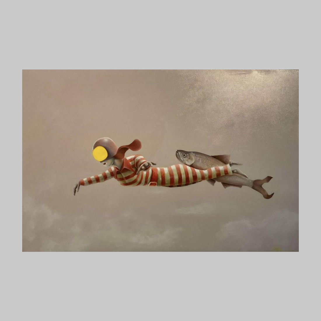 이 초현실적인 작품은 안개 낀 듯한 흐릿한 하늘 배경 속에서 수평으로 떠 있는 한 인물을 묘사합니다. 인물은 마치 죄수복을 연상시키는 붉은색과 흰색 줄무늬 의상을 입고 있으며, 머리에는 노란색 단안경 같은 것을 착용하고 있습니다. 인물의 허리 부분에는 크고 사실적인 물고기 한 마리가 단단하게 묶여 있거나 연결되어 있습니다. 제목 ‘Buddy(친구)’가 암시하듯이, 이 물고기는 단순한 짐이 아닌 인물의 뗄 수 없는 동반자 또는 수호자처럼 보입니다. 하늘을 나는 듯한 이 모습은 고립된 환경 속에서도 깊은 유대감을 통해 제약 없이 자유를 추구하는 존재의 역설적인 상황을 표현합니다. 작가 Gid Zim은 이 기묘한 조합을 통해 가장 예상치 못한 곳에서 발견되는 동행과 위안이라는 메시지를 전달합니다.