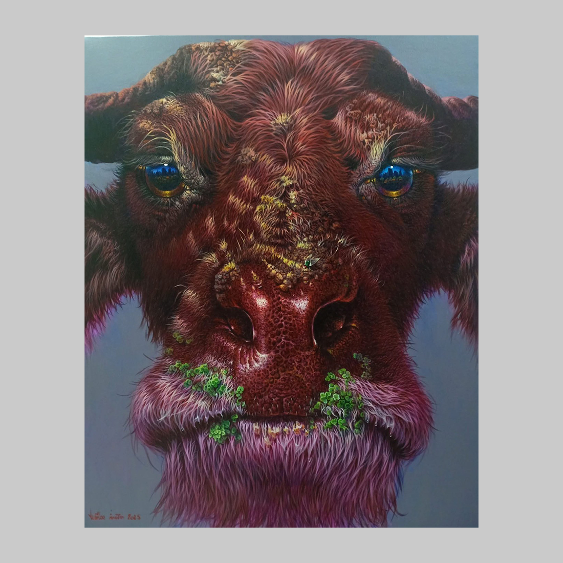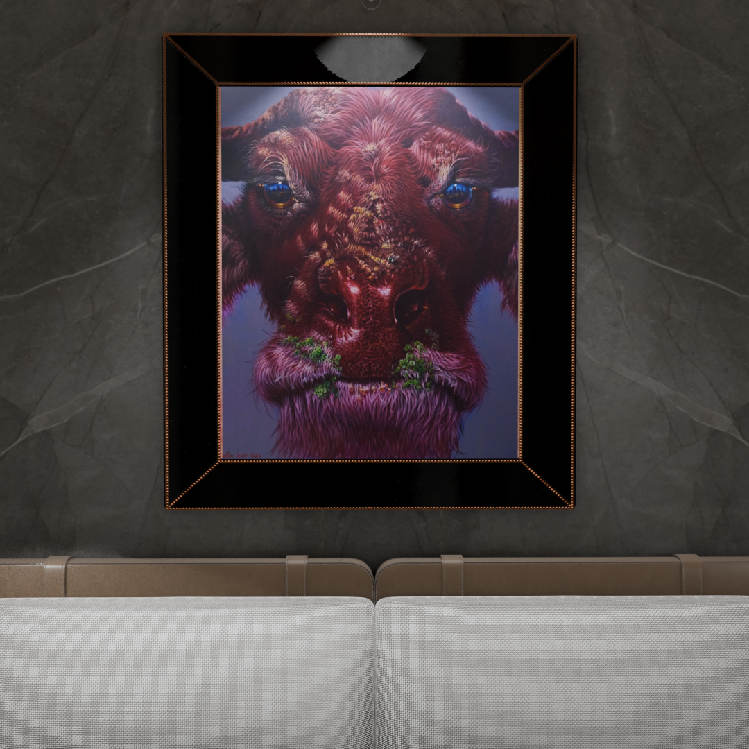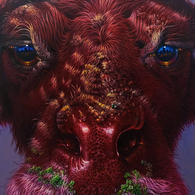 이 작품은 붉은색 털과 피부를 가진 거대한 소 또는 들소의 얼굴을 정면에서 포착합니다. 인물의 얼굴은 짙은 벽돌색과 진홍색으로 표현되어 원초적인 힘과 강렬한 에너지를 발산하지만, 눈동자는 강렬한 푸른색으로 빛나 신비롭고 깊은 내면의 통찰을 암시합니다. 가장 독특한 부분은 이 야성적인 얼굴의 코 주변과 턱 부분에 선명한 녹색의 식물 또는 이끼가 자라나고 있다는 점입니다. 이는 강인한 생명력과 자연의 재생 능력이 가장 격렬한 힘과 공존하고 있음을 시각적으로 보여줍니다. 푸른빛이 감도는 회색 배경은 이 존재를 더욱 신화적이고 고독한 분위기로 감쌉니다. 작가 Prathueang Kampat은 ‘침공’이라는 주제를 통해, 야생의 힘이 단순히 파괴적인 것이 아니라 생명과 영성을 담고 있으며, 우리 의식 속으로 침투하여 새로운 성장을 촉발한다는 메시지를 전달합니다.