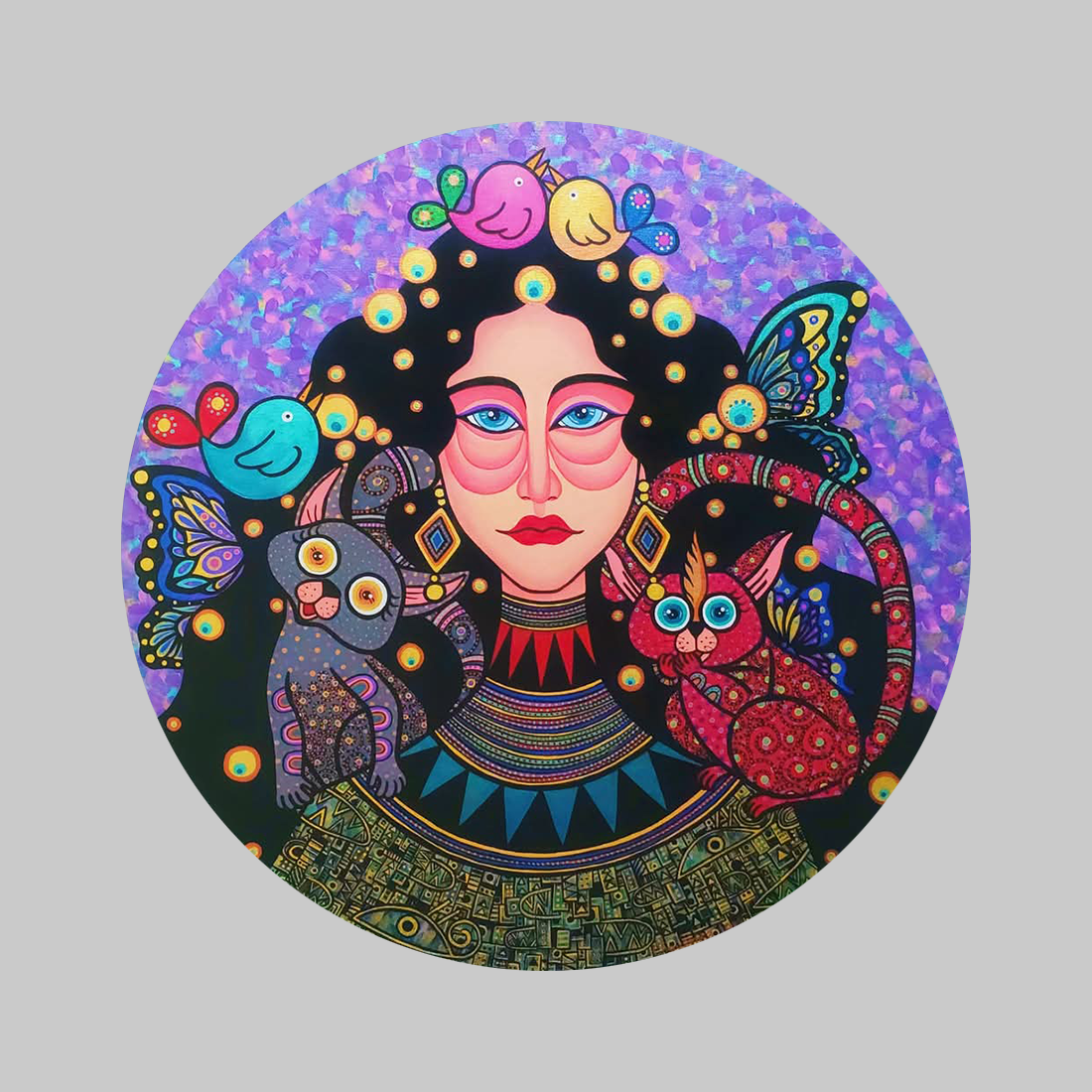 Bew Chayanisa Sriwichainan의 “Woman on Wednesday”는 원형 캔버스에 담긴 독창적인 아크릴 회화 작품입니다. 강렬한 푸른 눈을 가진 여성을 중심으로, 그녀의 검은 머리카락은 황금빛 점들과 핑크색, 노란색 새들로 장식되어 있습니다. 여성의 양옆에는 큰 눈을 가진 회색과 붉은색의 환상적인 동물들이 자리 잡고 있으며, 푸른 나비들이 그 주위를 감싸고 있습니다. 질감이 느껴지는 보라색 배경과 의상의 정교한 기하학적 패턴이 어우러져 신비롭고 몽환적인 분위기를 자아내며, 인간과 상상 속 생명체들의 따뜻한 교감을 아름답게 표현하고 있습니다.