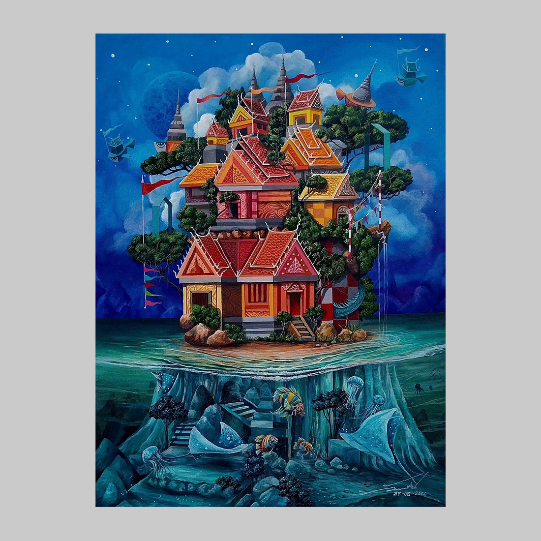 이 작품은 동양적 상징주의와 초현실적인 구도를 통해 ‘청정한 마음’이라는 주제를 해석합니다. 전통적인 사찰 건축물들은 거대한 눈알이나 거북이 등 위에 솟아 하늘을 향해 솟아오른 모습으로, 물질 세계를 초월한 영적 깨달음이나 정신적 가치에 대한 갈망을 표현합니다. ‘연꽃’과 ‘거북이’는 불교와 아시아 문화에서 순수함, 재생, 그리고 장수를 상징합니다. 작가는 이러한 요소들을 통해 혼란스러운 세상 속에서도 흔들리지 않는 ‘청정한 마음’을 유지하려는 간절한 소망을 환상적으로 그려냅니다.