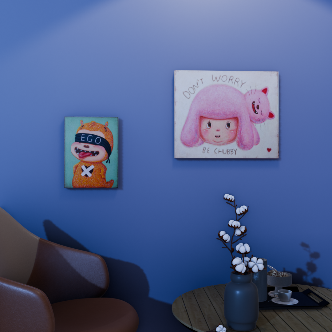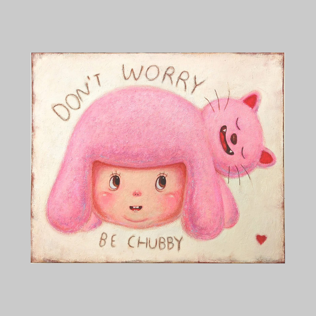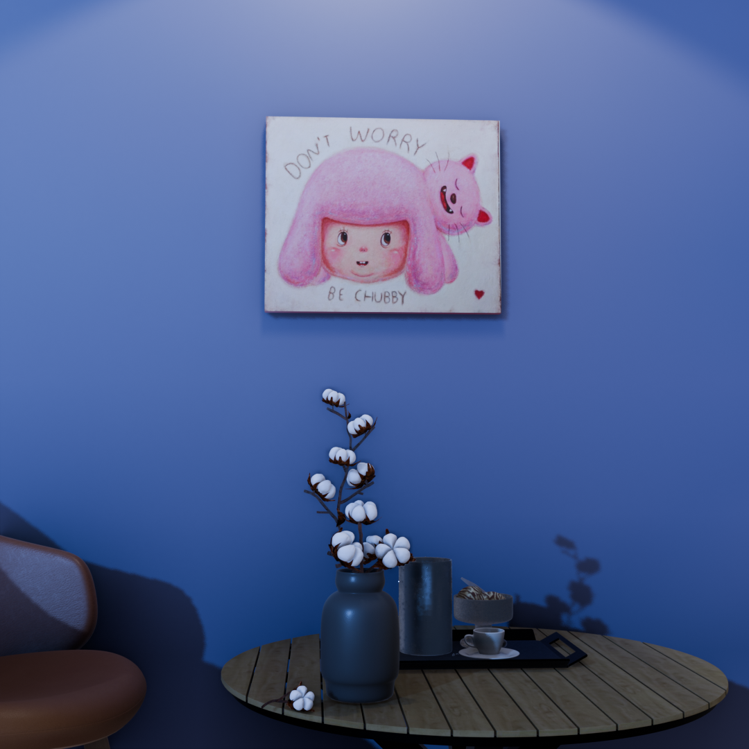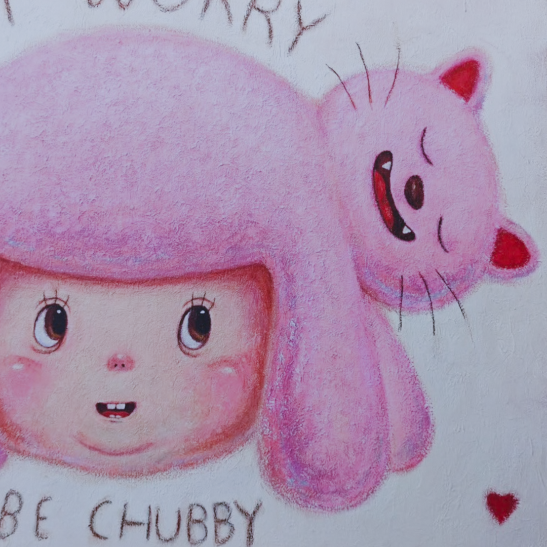 분홍색 털을 가진 인형 위에 고양이 한 마리가 느긋하게 누워 있습니다. “걱정 말고 통통하게 살자”라는 문구는 걱정 대신 귀엽고 통통한 일상을 즐기라는 메시지를 담고 있습니다. 이 작품은 있는 그대로의 자신을 사랑하는 행복을 기념합니다.