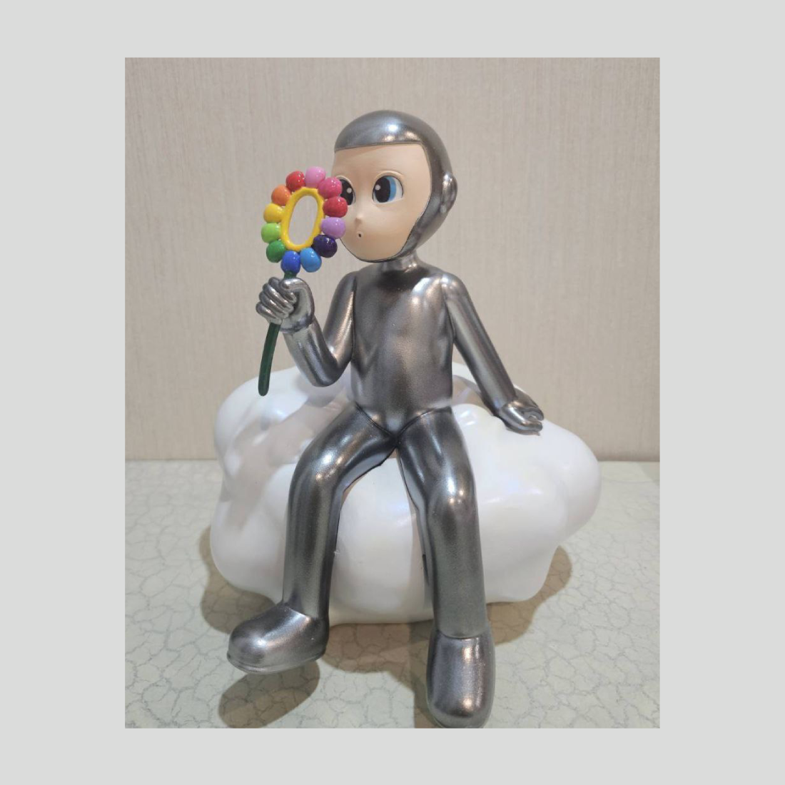 예술가 푸스 수티(Puth Sutee)가 제작한 이 매혹적인 조각품은 매끈한 메탈릭 실버 마감의 기발한 인물이 부드러운 하얀 구름 위에 앉아 있는 모습을 담고 있습니다. 크고 표정이 풍부한 눈이 특징인 이 인물은 생동감 넘치는 다채로운 꽃을 얼굴에 대고 있어, 산업적인 표면과 장난기 넘치고 유기적인 모티프 사이에 강렬한 대비를 이룹니다. 순수함과 상상력을 불러일으키는 이 작품은 보는 이를 팝 초현실주의의 몽환적인 세계로 초대하며, 고요한 호기심과 평온함의 순간을 포착합니다.