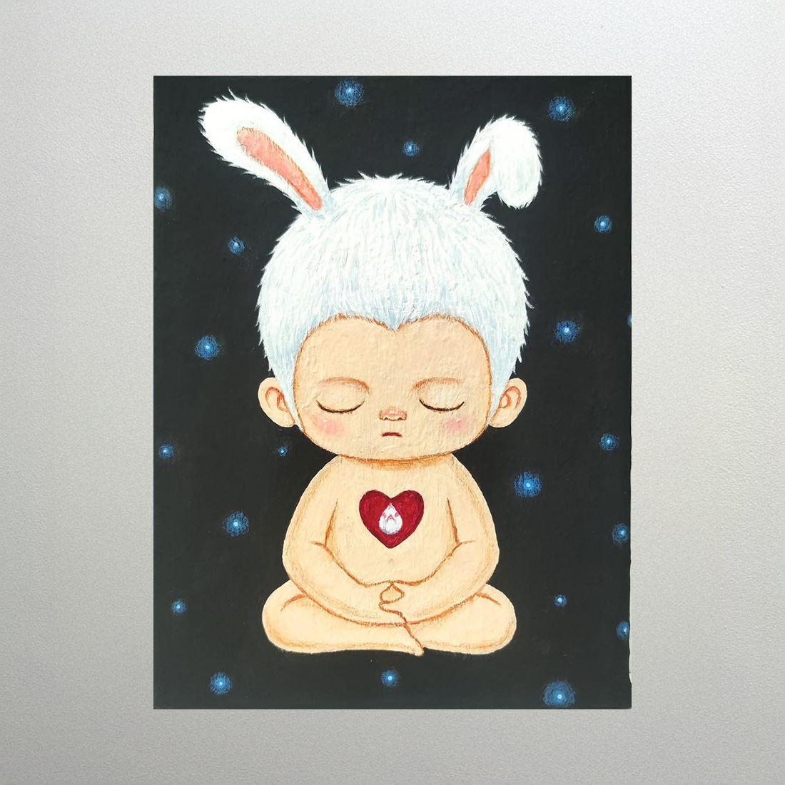 이 작품은 토끼 귀를 한 인물이 가부좌를 하고 명상하며 현재에 집중하는 순간을 포착합니다. 어두운 배경과 별처럼 작은 점들은 현실의 소음과 복잡성을 상징하지만, 인물은 눈을 감은 채 고요함을 유지합니다. 가슴에 박힌 수정 같은 심장은 내면의 깨달음과 평온을 상징합니다. 이 작품은 외부의 혼란 속에서도 내면의 고요함을 찾아 진정한 안식을 추구하는 현대인의 모습을 묘사합니다.