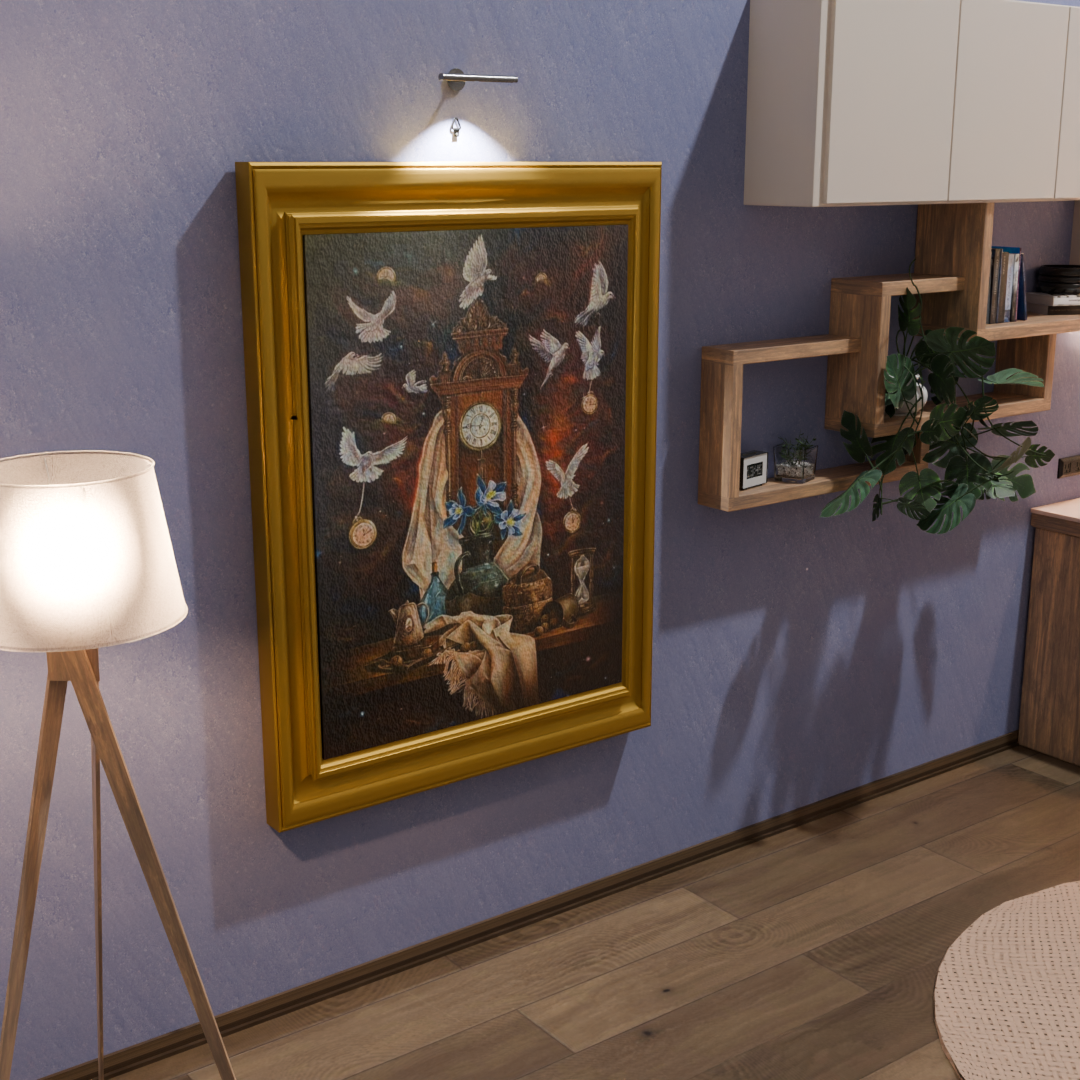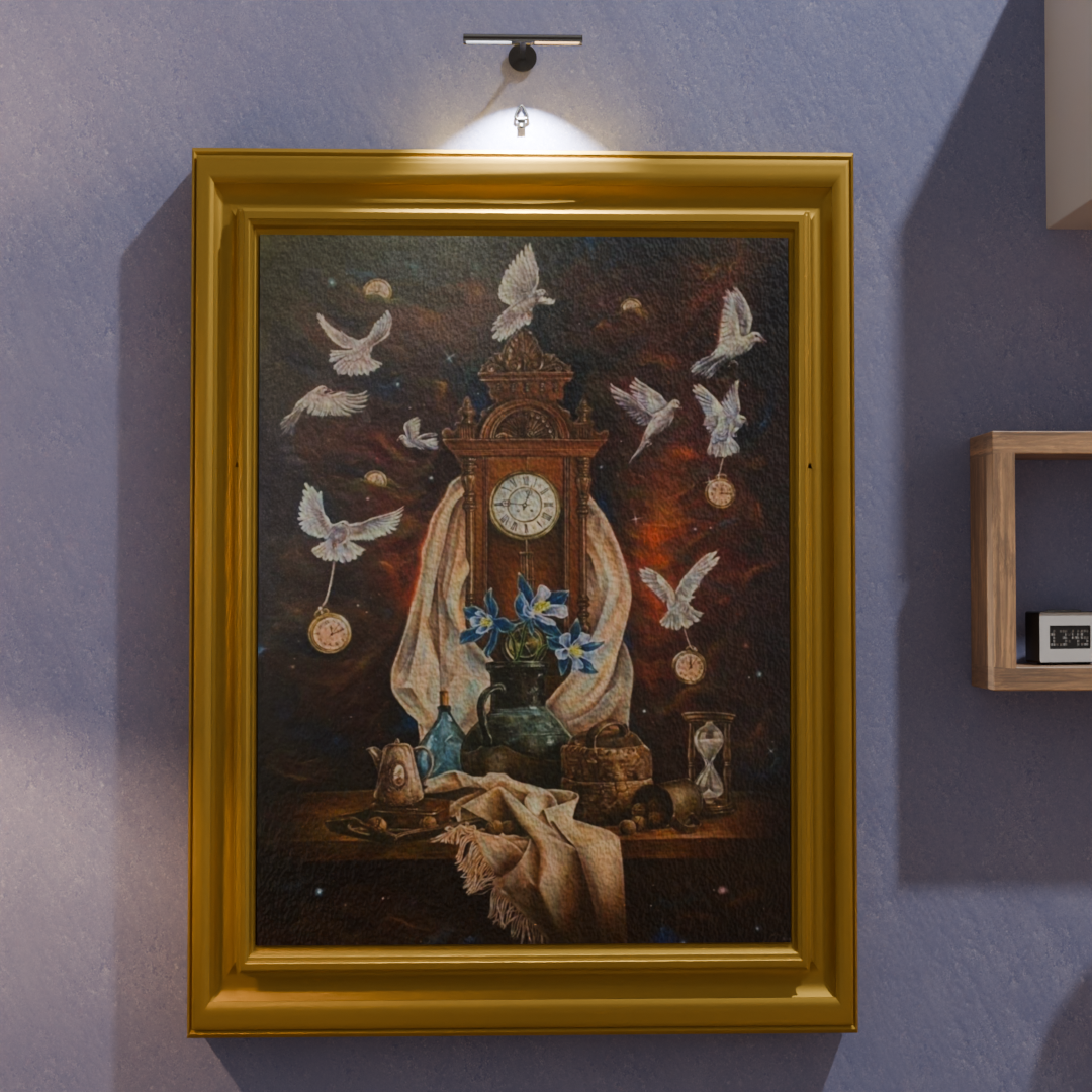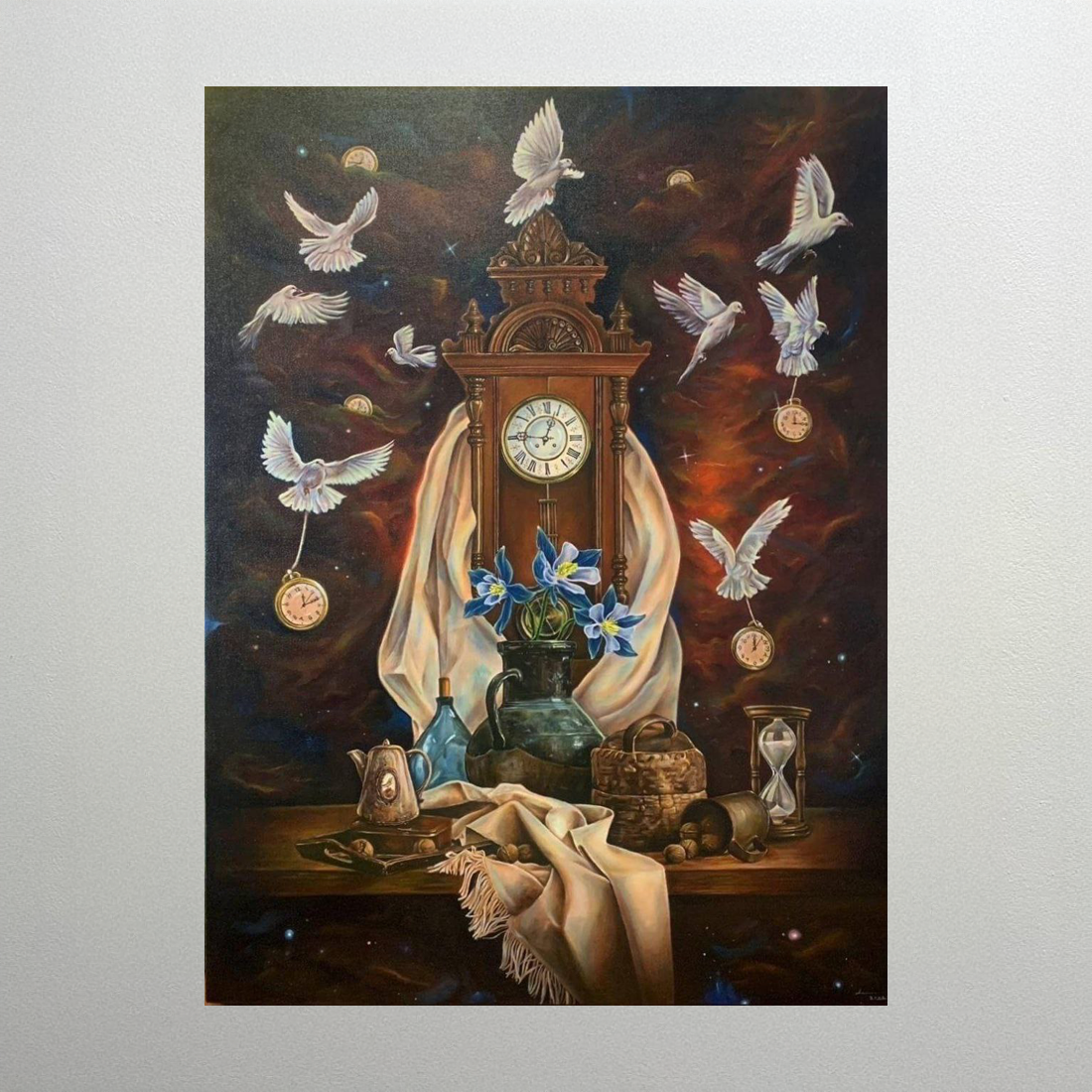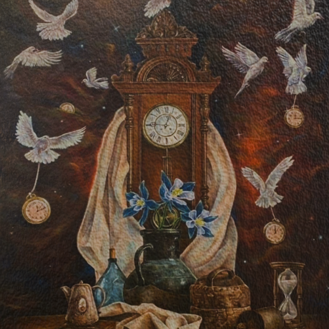 이 작품은 정물화의 전통적인 구성을 따르지만, 시간과 상실에 대한 사색적인 질문을 던지는 초현실적인 배열을 제시합니다. 앤티크 시계, 물병, 유리병과 같은 고전적인 정물들이 테이블 위에 배치되어 있지만, 배경은 붉은색과 검은색 성운으로 가득 찬 광대한 우주입니다. 흰 비둘기들이 시계 주변을 날아다니는데, 각 비둘기는 발에 낡은 회중시계를 매달고 있습니다. 이는 **영원한 평화의 상징(비둘기)**과 시간의 흐름 사이의 대비를 통해 삶의 덧없음을 은유적으로 시사합니다. 작가는 이러한 친숙한 ‘형태와 사물’을 우주적 환경 속에 배치함으로써, 평범한 물건들이 시간의 흐름 속에서 지니는 실존적인 ‘미학’과 의미를 탐구합니다.