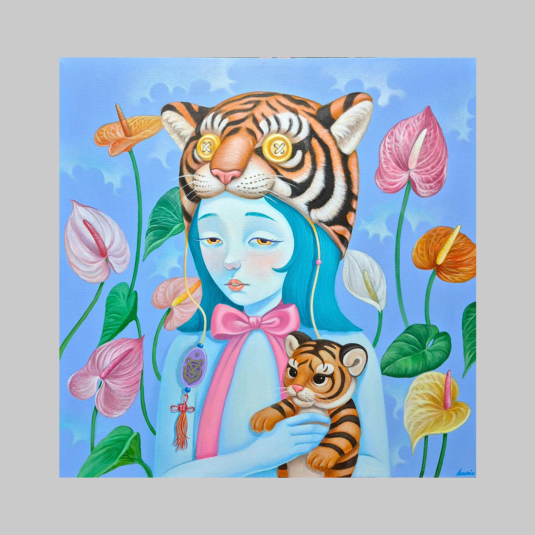 작가 **Saengrawee Klangmanee (쌩라위 끌랑마니)**의 ‘Tiger(호랑이)’는 힘과 연약함이 공존하는 내면세계를 환상적인 색채로 그린 초상화입니다. 이 작품은 푸른 피부의 소녀가 사나운 호랑이 모자를 쓰고 작은 호랑이 인형을 품에 안고 있는 모습을 특징으로 합니다. 모자의 눈은 금화로 대체되어, 소녀가 외적으로 추구하거나 감춰야 하는 힘, 용기, 혹은 물질적 가치를 상징하는 듯합니다. 소녀는 분홍색과 주황색의 안스리움(Anthurium) 꽃들에 둘러싸여 이국적이고 꿈결 같은 분위기를 더합니다. 호랑이가 상징하는 강한 보호 본능은 소녀의 푸른 피부와 애처로운 표정에서 암시되는 취약함과 섬세함과 극명하게 대조됩니다. 이 작품은 가장 연약한 자아를 가장 강인한 외면으로 보호하려는 현대인의 심리 상태를 우아하게 은유합니다.