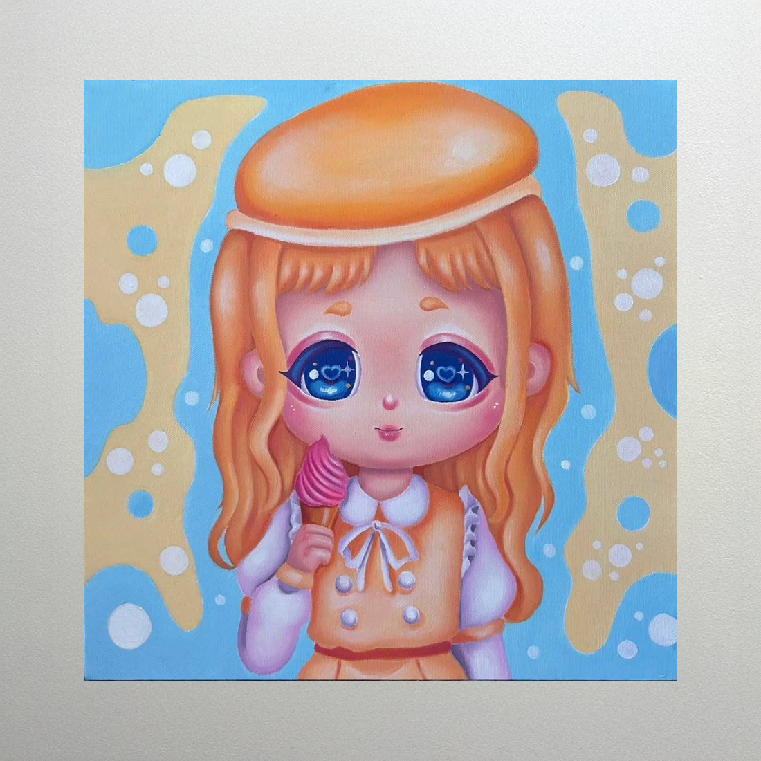 이 작품은 화창한 월요일 아침처럼 밝고 쾌활한 분위기를 발산하며, 파란색과 노란색 의상에 주황색 베레모를 쓴 소녀가 분홍색 아이스크림 한 스쿱을 들고 있는 모습을 담고 있습니다. 그녀의 크고 표현력이 풍부한 눈은 하트 모양의 반짝임을 담고 있어 순수한 행복을 전달하며, 전반적으로 부드러운 색감과 깔끔한 배경은 새로운 한 주를 시작하는 달콤한 설렘을 성공적으로 전달합니다.