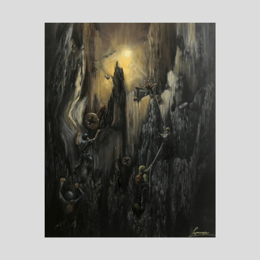 파파와린 수리야움폰의 아크릴 캔버스 작품은 신비로운 황금빛이 감도는 거대한 협곡을 오르는 사람들의 장면을 극적으로 묘사한다. 거칠고 어두운 환경 속에서 함께 버티며 나아가는 인물들은 고난 속에서도 희망을 향해 나아가려는 인간의 끈기와 연대, 그리고 초월의 순간을 상징한다.