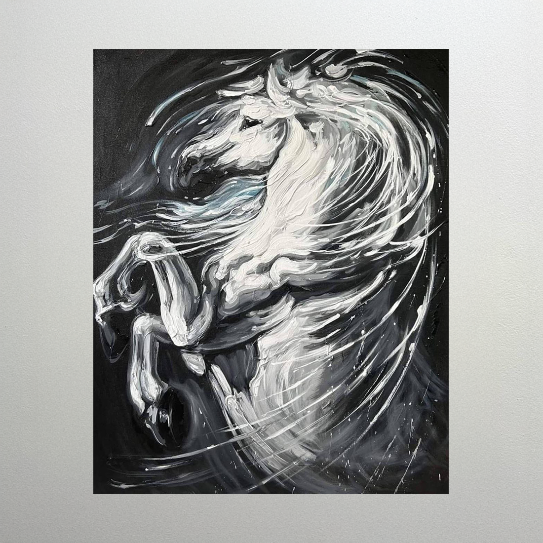 이 작품은 흰 야생마가 어두운 배경과 극적으로 대비되며 뒷발로 일어선 순간을 포착합니다. 거칠고 생동감 있는 붓 터치는 말의 갈기와 꼬리가 마치 폭풍처럼 휘날리는 듯한 느낌을 줍니다. 검은색과 선명하게 대조되는 순백의 몸체는 자유, 순수함, 그리고 길들여지지 않은 영혼의 힘을 상징적으로 구현합니다. 격렬한 움직임과 빛나는 흰색은 활력과 열정을 동시에 불러일으키며, 관람객에게 강렬한 에너지를 전달합니다.