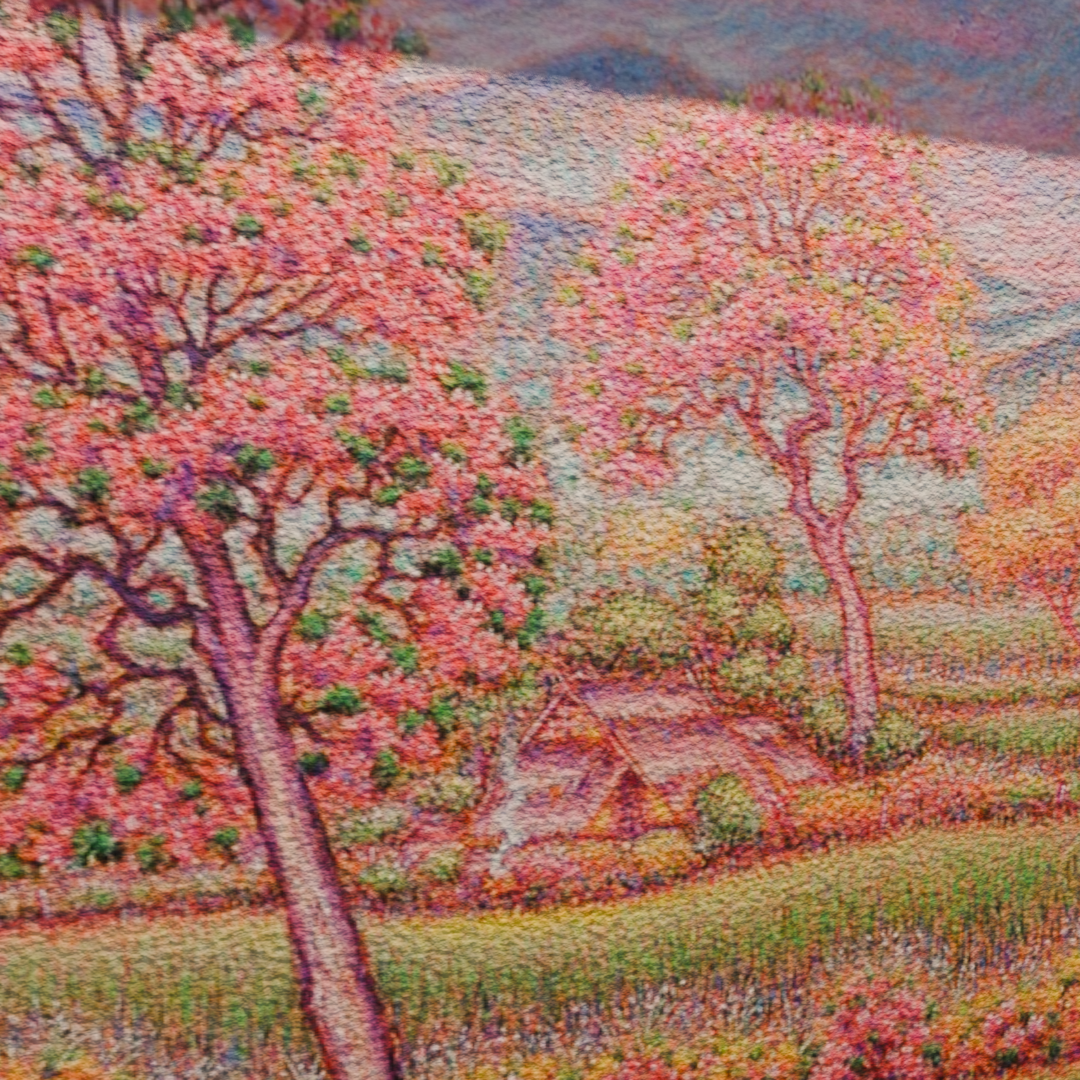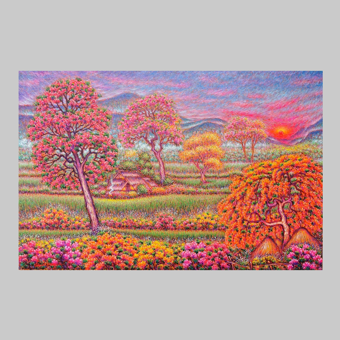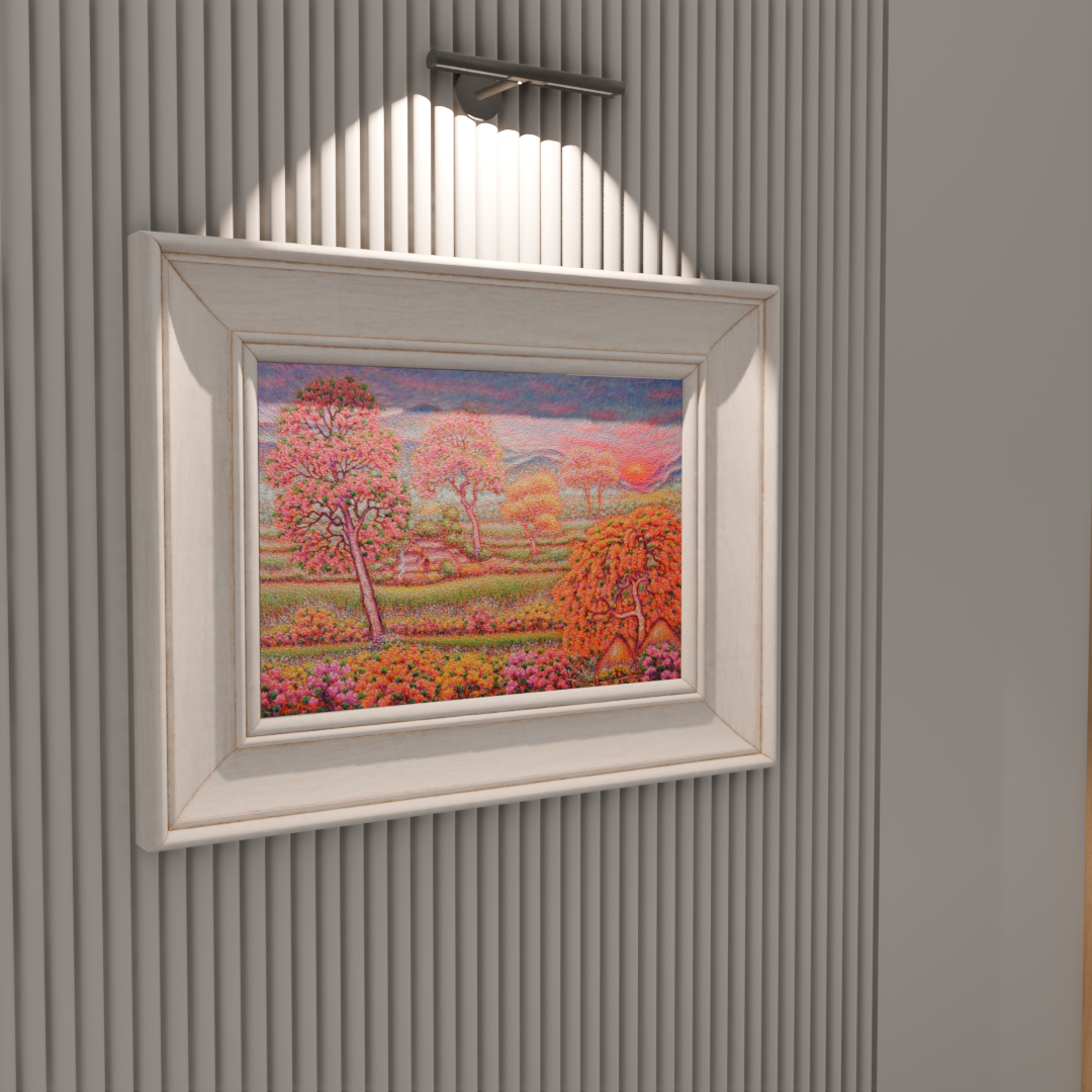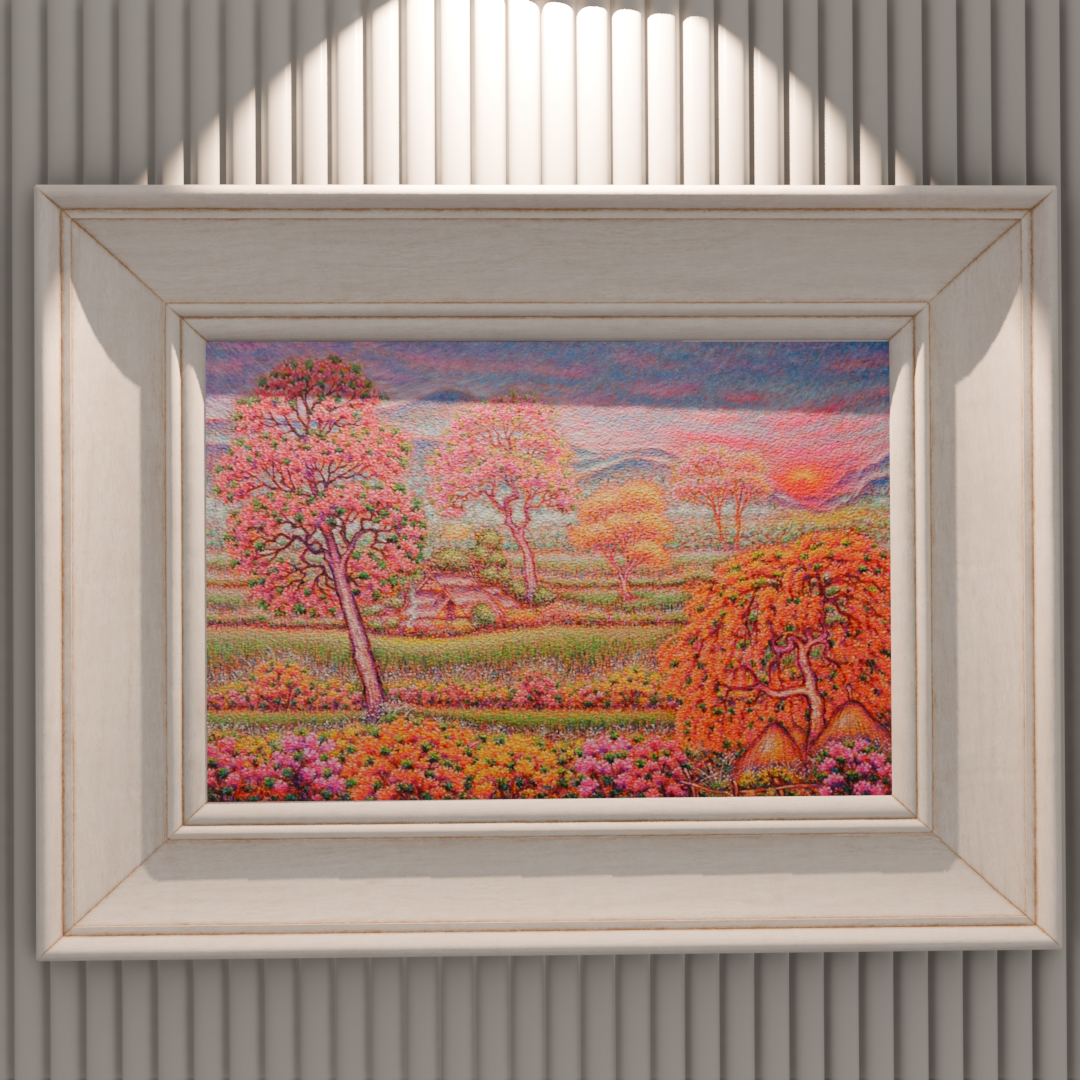 이 작품은 태국의 시골 풍경을 연상시키는 풍경을 눈부시게 밝은 색상으로 표현합니다. 캔버스 전체는 수많은 작은 색점들로 이루어져 있어, 빛과 색채가 끊임없이 진동하는 듯한 환상적인 질감을 만들어냅니다. 배경으로는 푸른 산맥과 그 위로 지는 붉은 석양이 보이며, 전경에는 주황색, 분홍색, 노란색 꽃들이 만개한 들판이 펼쳐져 있습니다. 특히 눈에 띄는 것은 활짝 핀 분홍색과 주황색의 꽃나무들입니다. 2월은 태국에서 건기가 끝나고 화사한 꽃들이 피어나는 계절을 상징하며, 작가는 이 시기의 자연이 선사하는 생명력과 풍요로움, 그리고 따뜻한 희망을 시각화합니다. Jirasak Liwthaisong은 이 작품을 통해 현실의 풍경을 넘어선 내면의 이상향을 보여주며, 자연과의 깊은 교감에서 오는 평온함과 활력의 메시지를 전달합니다.