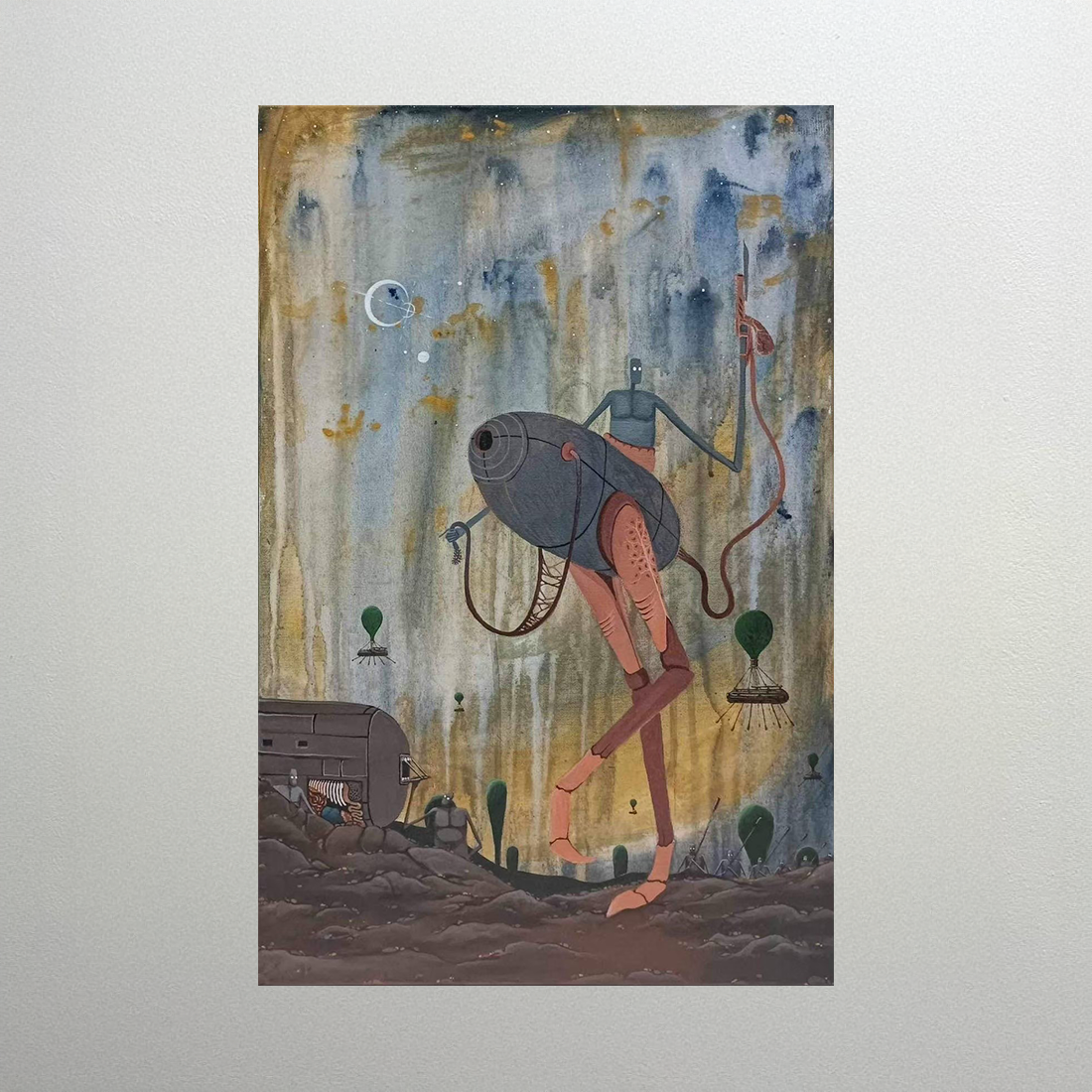 “이 작품은 여섯 개의 긴 다리를 가진 기이하고 유기적-로봇적인 생명체를 중심으로 하며, 그 위에 앉은 작은 로봇 형상이 이를 조종하는 듯합니다. 이 로봇은 고립되고 황량한 풍경 위를 성큼성큼 걷고 있습니다. 배경에 다른 작은 부유체나 희미한 형상들이 존재할 수 있지만, ‘6명의 사람들(6 People)’이라는 제목은 아마도 이 압도적인 생명체를 포함하여 프레임 안에 있는 존재들의 수나 집단적인 고독을 암시하는 것 같습니다.”