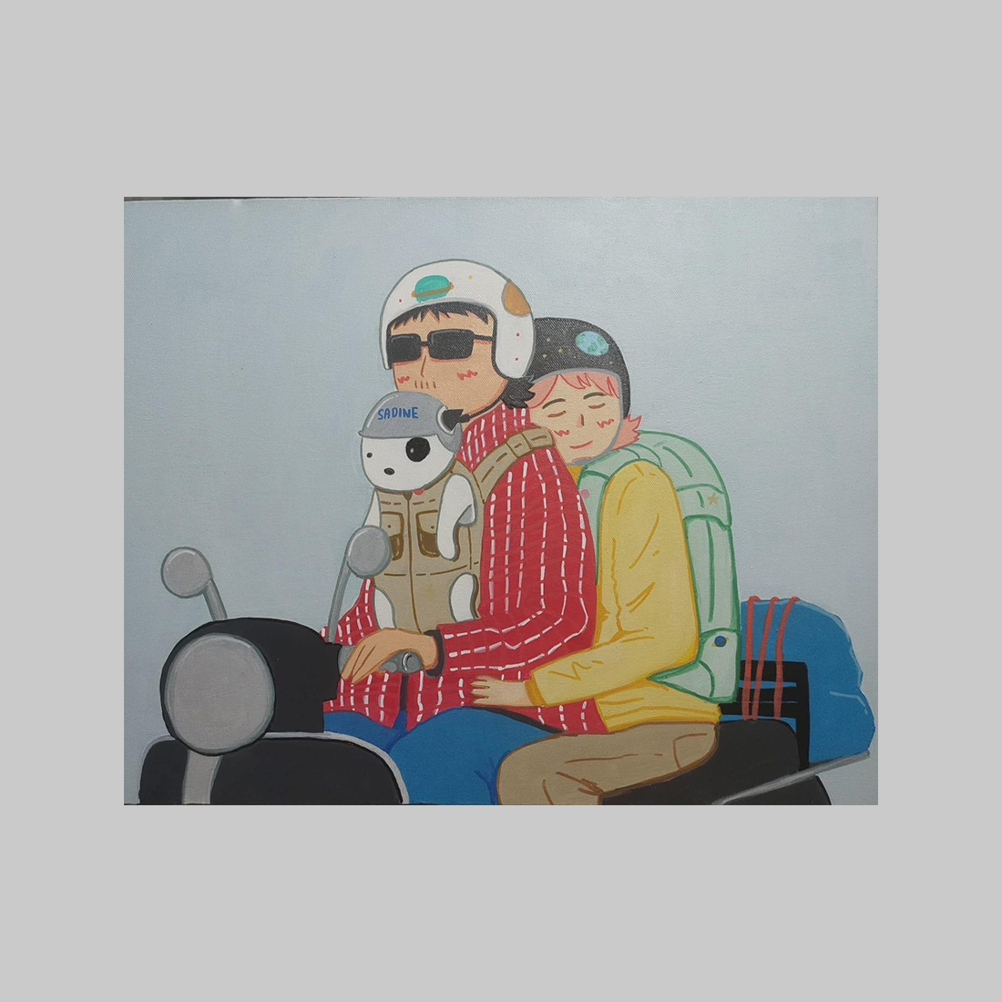 작가 **Somporn Phromutai (솜폰 프롬우타이)**의 ‘800 KM’는 단순한 여행기가 아닌, 삶 속의 사랑, 유대감, 그리고 동반자 관계에 대한 따뜻한 이야기입니다. 밝고 평화로운 색채로 그려진 이 작품은 한 커플과 그들의 작은 로봇 동반자가 스쿠터를 타고 긴 여정을 떠나는 모습을 포착합니다. 헬멧을 쓴 인물은 도로에 집중하며 운전하고 있고, 뒷좌석의 탑승자는 편안하게 기대어 잠들어 있습니다. 특히 눈에 띄는 것은 운전자의 가슴에 아기띠처럼 안겨 있는 듯한 순백의 로봇입니다. 이 로봇은 현대 사회의 새로운 형태의 가족 또는 동반자 관계를 상징하며, 그들의 여정에 유머러스하면서도 미래적인 따뜻함을 더합니다.