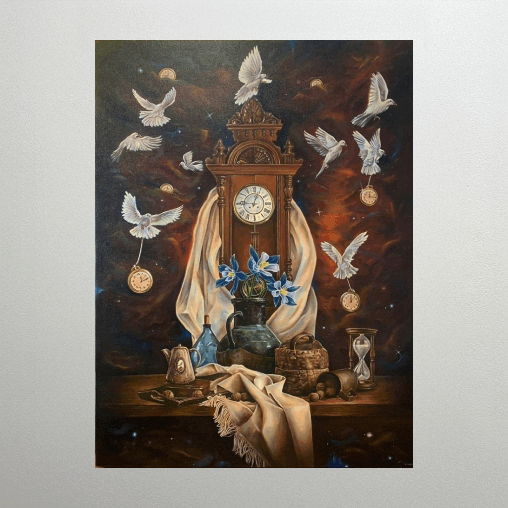This artwork adheres to the traditional composition of a still life but presents a surreal arrangement that poses contemplative questions about time and loss. Classical still life objects like an antique clock, pitchers, and bottles are arranged on a table, yet the background is a vast cosmos filled with red and black nebulas. White doves fly around the clock, each carrying an old pocket watch tethered to its feet, metaphorically suggesting the transience of life through the contrast between the passage of time and the symbol of eternal peace (the dove). By placing these familiar ‘shapes and objects’ within a cosmic setting, the artist explores the existential ‘aesthetics’ and meaning that ordinary objects hold within the flow of time.