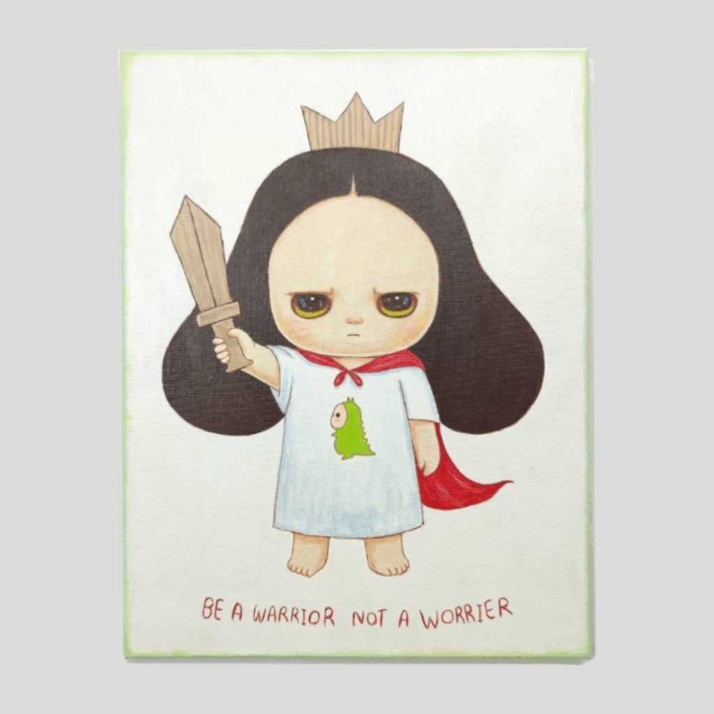 “Be a Warrior Not a Worrier” is an empowering artwork by Jiro Jiro. Using acrylic, oil pastels, and colored pencils on canvas, the artist depicts a determined girl in a paper crown and red cape, holding a wooden sword. Her large, expressive eyes convey a quiet strength. Whimsical details, like the dinosaur on her shirt, blend childhood innocence with a message of courage. The rich texture created by the mixed media enhances the character’s bold yet adorable presence, inspiring viewers to face fears with bravery.