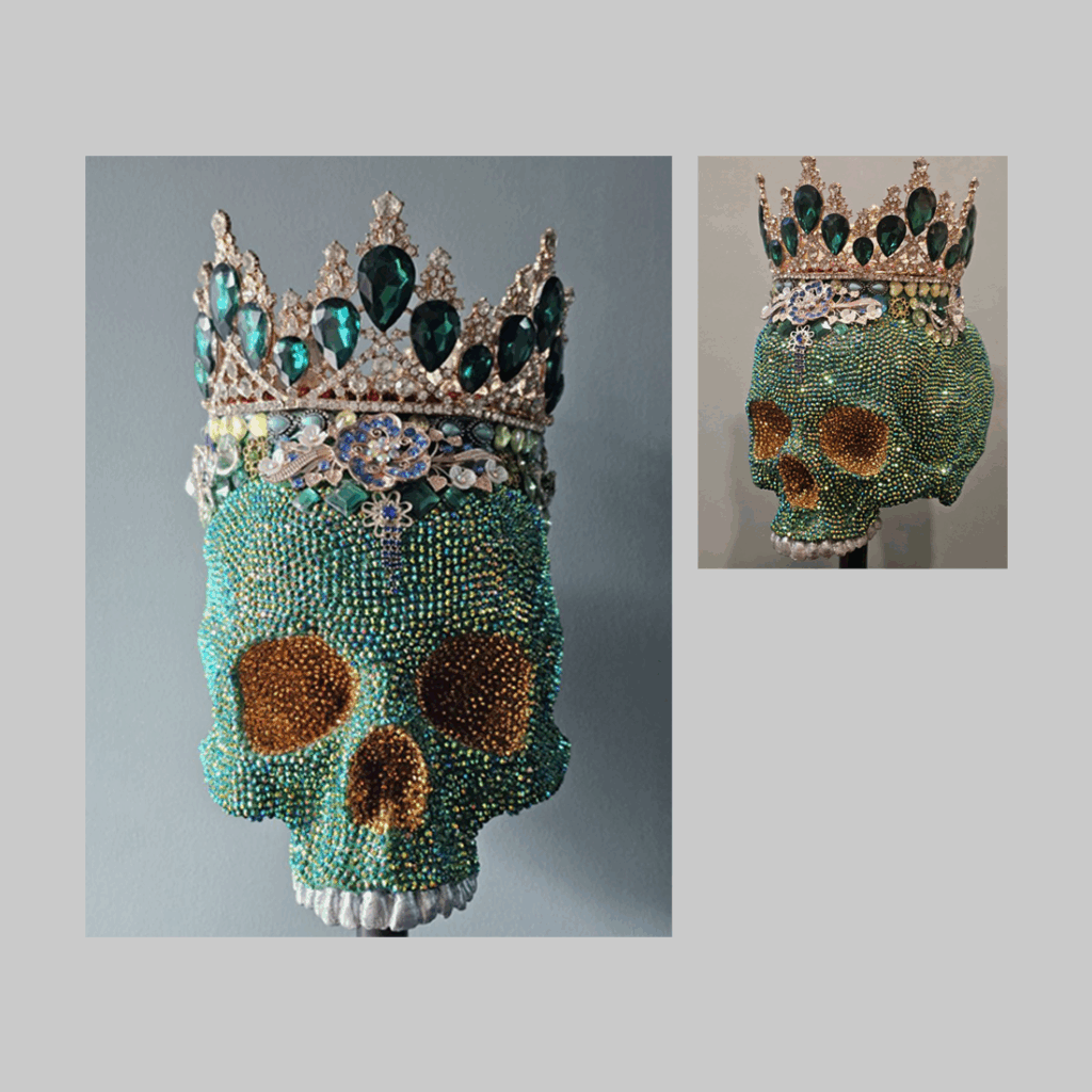 ‘Beautiful of life No:22’ by artist Pongsatorn Tipasatien explores the tension between life’s transience and eternal beauty by adorning the universality of death in the most opulent and majestic way. The skull sculpture is entirely covered in microscopic teal and green beads, creating a texture that shimmers like precious metal. The eye sockets are filled with gold or amber-toned beads, intensely drawing the viewer’s gaze. A luxurious crown, set with large, emerald-colored gems, sits atop the skull, contrasting the skull’s meaning of mortality with the crown’s symbolism of power and permanence. By adding lavish ornamentation to the unavoidable reality of death, the artwork metaphorically expresses the value and dignity that humanity pursues despite its ephemeral nature, prompting deep reflection on the title, ‘Beautiful of life.’