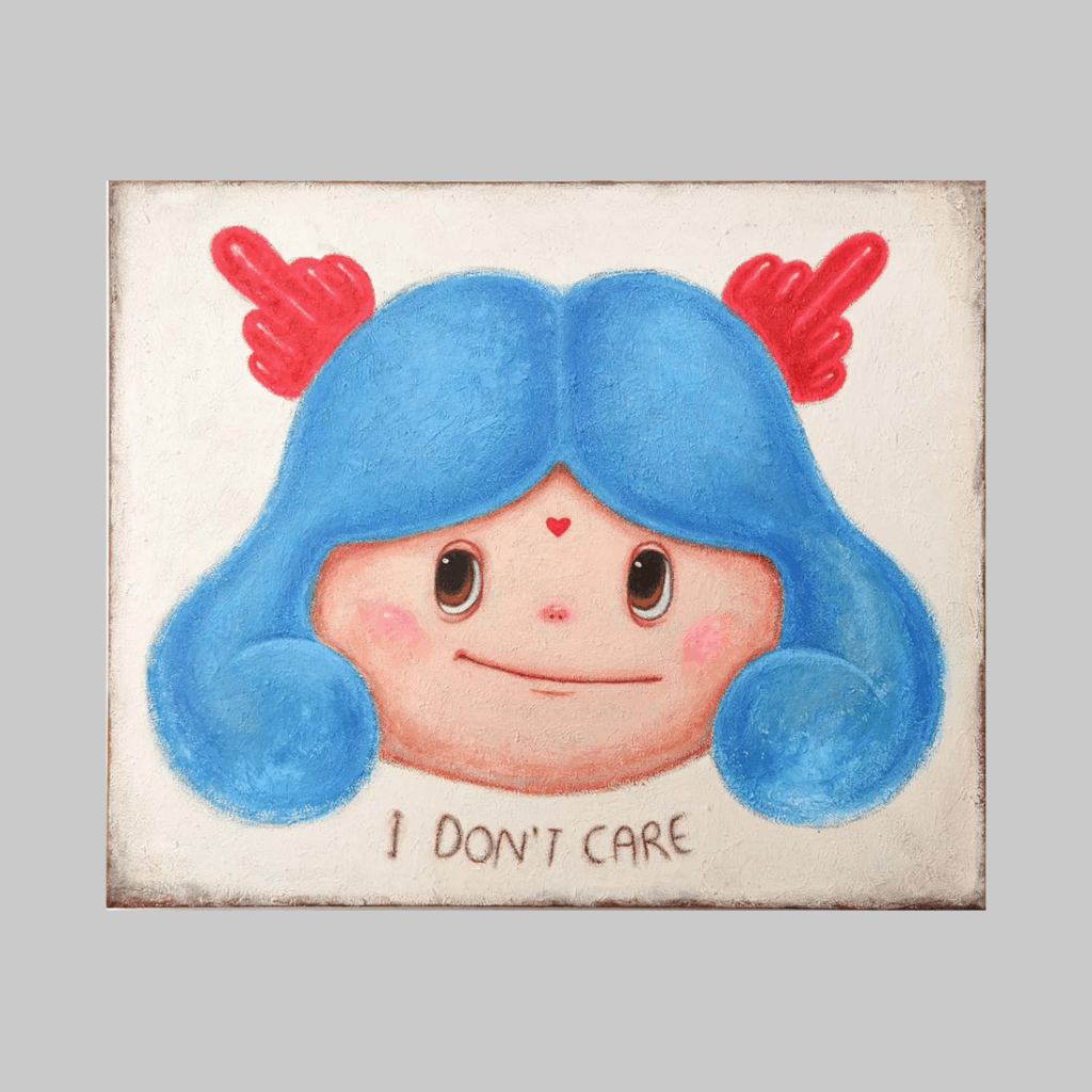 The face of the child with blue hair is inscribed with the phrase ‘I don’t care’. Hidden within the wing-shaped ornament and the smile is a sense of ease that lightly dismisses the world’s gaze. This work showcases a free spirit that is unconstrained by the judgment of others.