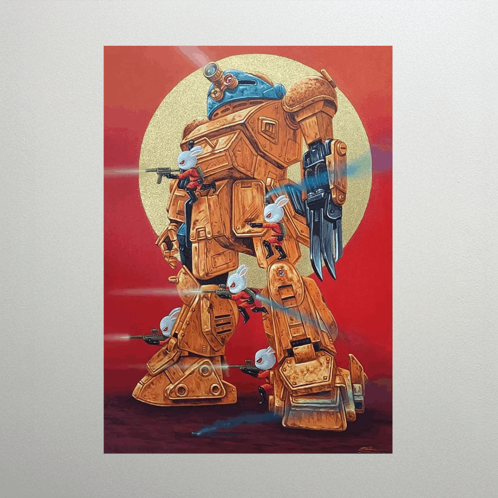 Against an intense red background and a golden halo, a colossal gold robot dominates the scene. The bunny legion clings to and fires weapons from various points on the robot’s exterior. The overwhelming scale and gold color symbolize power and wealth, and the bunnies’ unified charge, as if they are an extension of the machine, is a transcendental representation of modern individuals serving the machine of consumption and power.