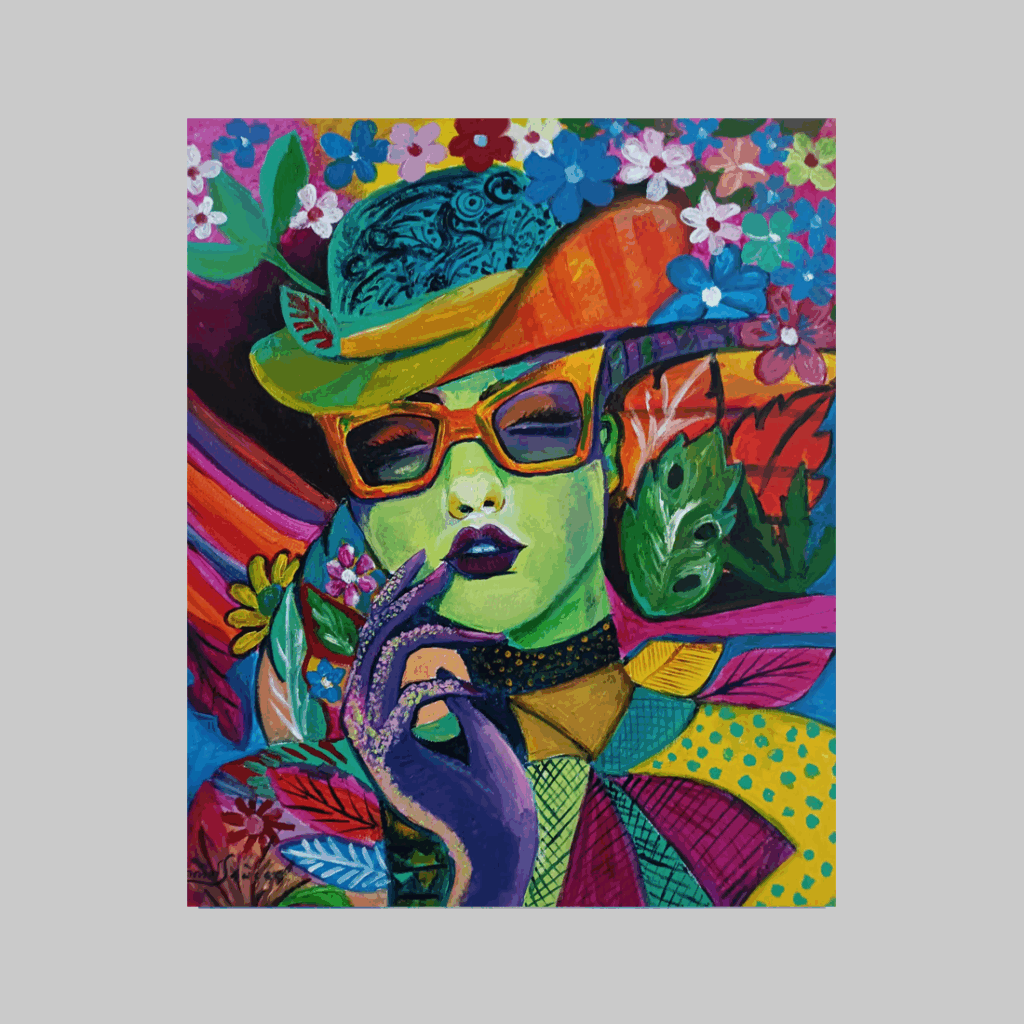 The artwork features a woman with vibrant green skin, an ornate hat, and closed eyes. The surrounding flowers and patterns are visual fragments that unfold her inner emotions.  Her fingertips and expression convey the vibrations of her internal world. Through the superposition of brilliant colors, the work reveals that human emotion is the purest raw material for art.