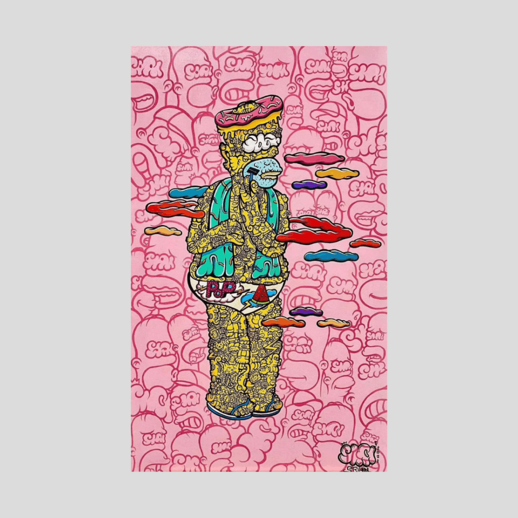 In this Acrylic on Canvas piece, Siriwan Simingam reimagines popular culture icons as intricate ornamental beings. The figure stands amid soft pink patterns and colorful clouds, wearing both absurdity and grace. Through layered lines and gleaming tones, the artist transforms familiar imagery into a delicate exploration of modern myth, memory, and inner humor.