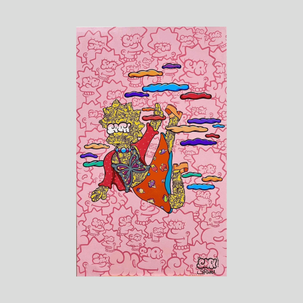 In this Acrylic on Canvas piece, Siriwan Simingam fuses pop culture with surreal shapes and Thai ornamental rhythm. The golden figure floating amid pink clouds showcases playfulness through intricate doodles and dazzling colors. Hidden beneath humor lies reflection on identity and visual saturation in modern life—a vivid bridge between digital fantasy and cultural motifs.