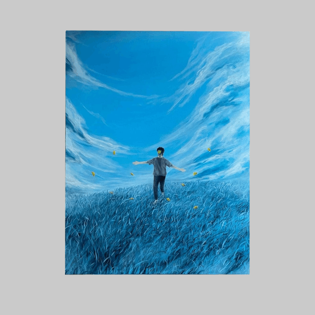 Two enormous hands rise from below in a deep blue background, cradling a small figure enveloped in white, smoke-like clouds. This composition expresses feelings of protection and rediscovery. The question ‘Am I a stranger to you?’ written on the wrist suggests the figure was questioning their existence within relationships, and now, being found and embraced by these massive hands, they have regained inner stability.