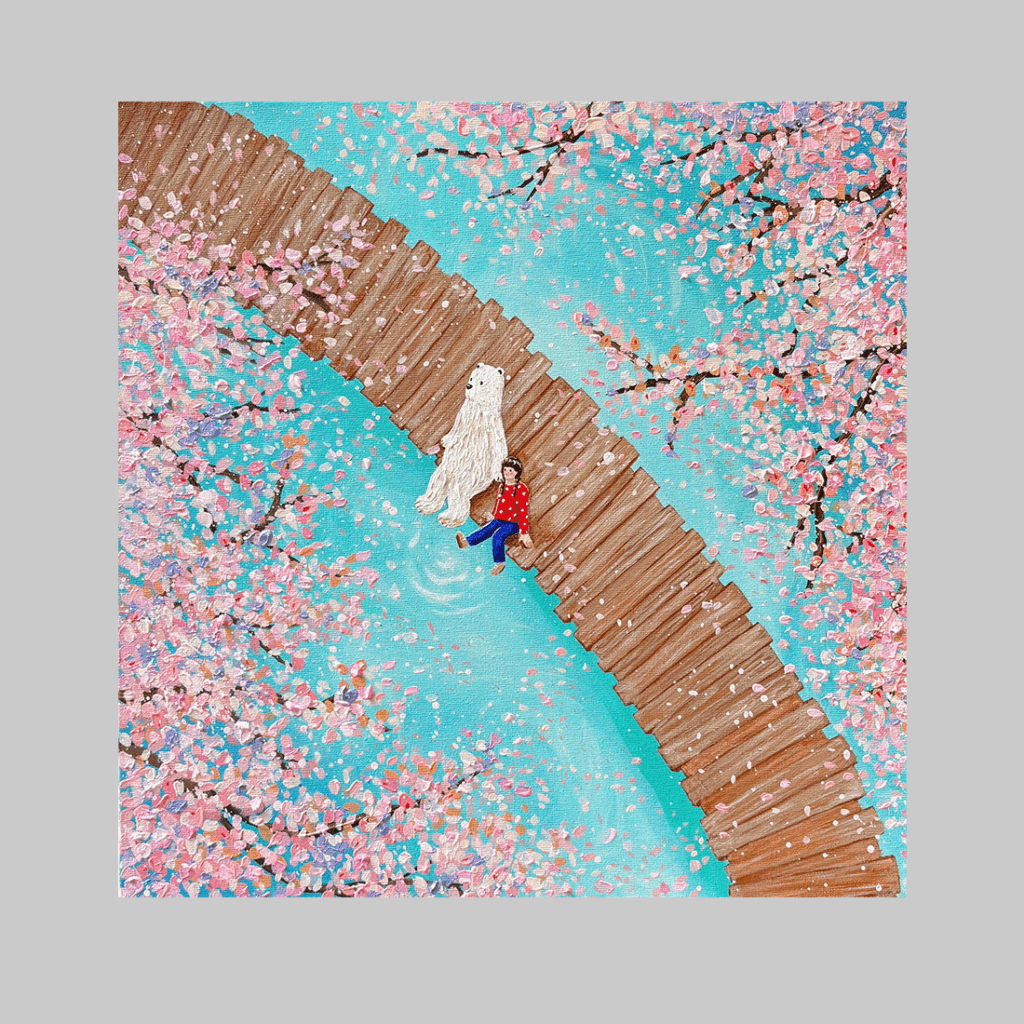 Capturing the peak of spring, this piece uses a top-down perspective to show the girl and the polar bear sitting together on a wooden bridge crossing clear, blue water surrounded by blooming cherry blossoms. The girl dangles her feet in the water, and the bear sits beside her. The full bloom of the cherry blossoms and the cool blue water symbolize free and peaceful emotion, conveying true mental liberation through the image of two friends spending a pure moment in nature, away from the complexities of the world.