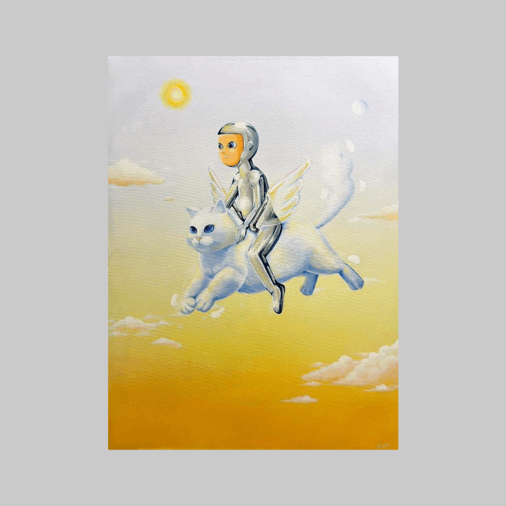 This artwork expresses a yearning for the companionship and freedom found with a pure ‘Friend.’ A chrome figure is riding atop a white, winged cat, flying together through a golden-hued sky. The combination of the cold, metallic figure and the warm, vital cat friend symbolizes an ideal relationship where technology and spirit, reason and emotion, achieve harmony. Their journey through the clouds and past the rising sun suggests a joyful and hopeful quest toward freedom and infinite possibilities, unconstrained by the limitations of reality.