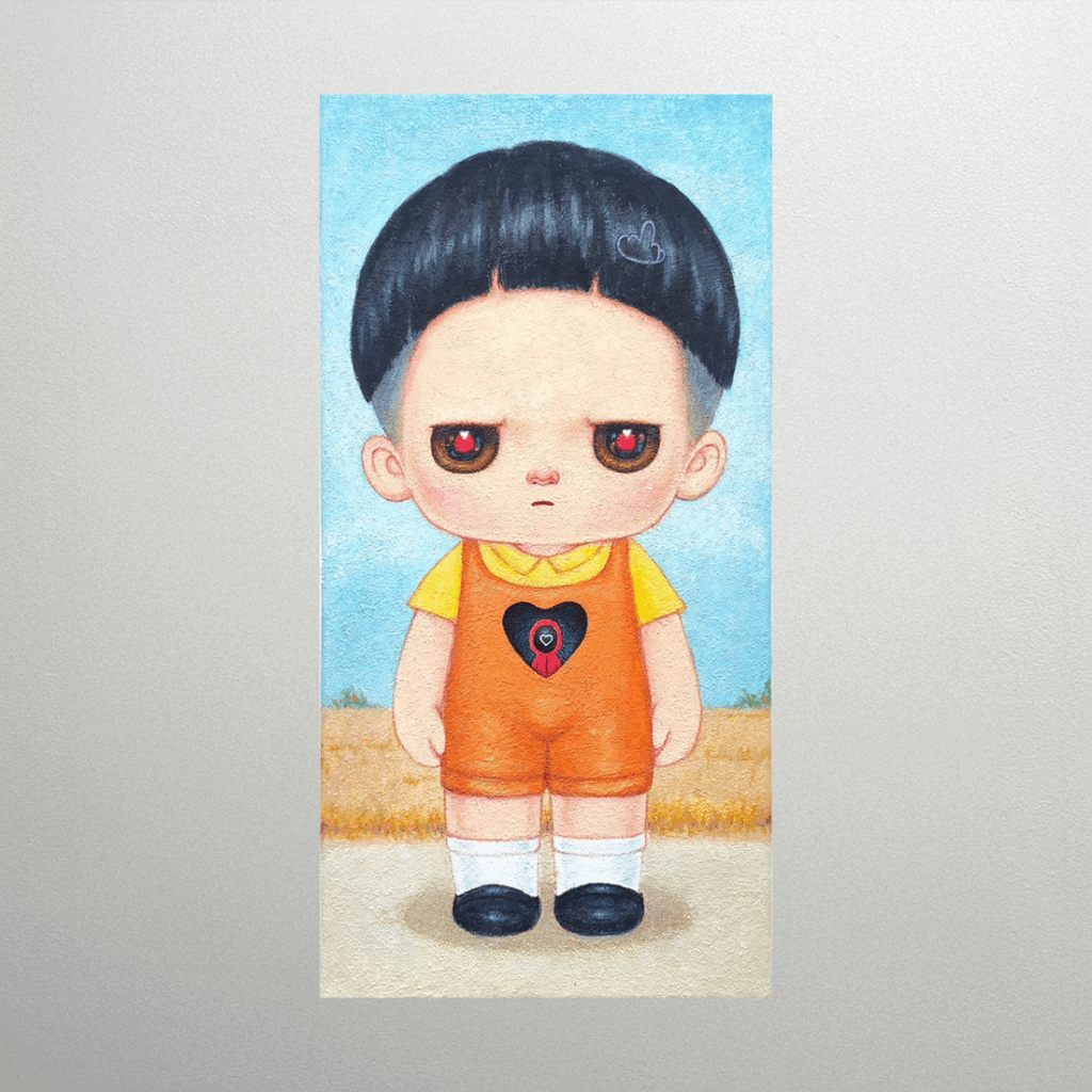 Seemingly motivated by the Netflix series ‘Squid Game,’ this piece features a child with a short bob haircut and an orange uniform, wearing a serious expression. A heart on the chest bears a surveillance camera motif, suggesting that the harsh rules of control and competition have infiltrated the child’s innocence. The title, “GAME ON!,” emphasizes that this child has already been thrown into a brutal survival game.