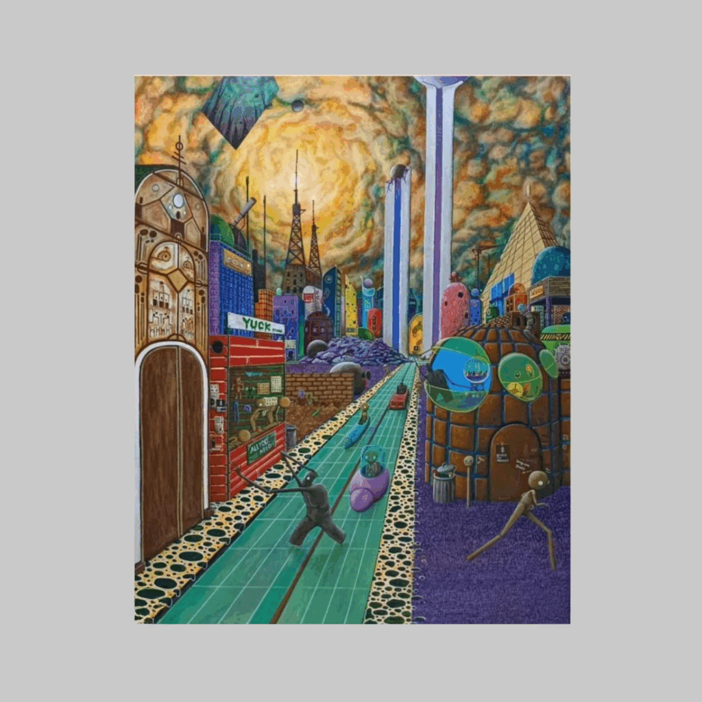 The title “Geronimo” evokes a fearless leap — as if plunging headfirst into a dazzling, surreal cityscape. Within this piece, imagined creatures, futuristic architectures, and eccentric structures intertwine chaotically, mirroring the complexity of modern society. The vivid colors and intricate details pulse with energy, revealing vitality even amidst confusion. Ultimately, the work feels like an invitation — a daring call to venture into the unknown worlds of imagination.