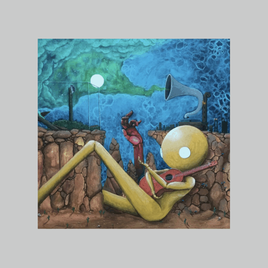 ‘Golden Song with a Crimson Hand’ by artist Andew Chaiphak is a captivating work that explores art and internal solitude within a bleak, surreal landscape.  Against a contrast of a dark and unsettling blue sky and ochre rock formations, a golden, spherical being with long limbs lies playing a guitar (or ukulele). The appearance of this strange entity symbolizes the isolated self or pure creative spirit. Notably, a giant crimson hand rises eerily from the background, hinting at an impending threat, past trauma, or an external force hindering creative expression.  With the addition of a horn-shaped loudspeaker and pale blue moonlight, the atmosphere becomes dreamlike. The work speaks to the power of art that blossoms even in darkness and solitude, and the sublime resistance of the individual who plays their own song despite external pressures (the crimson hand).