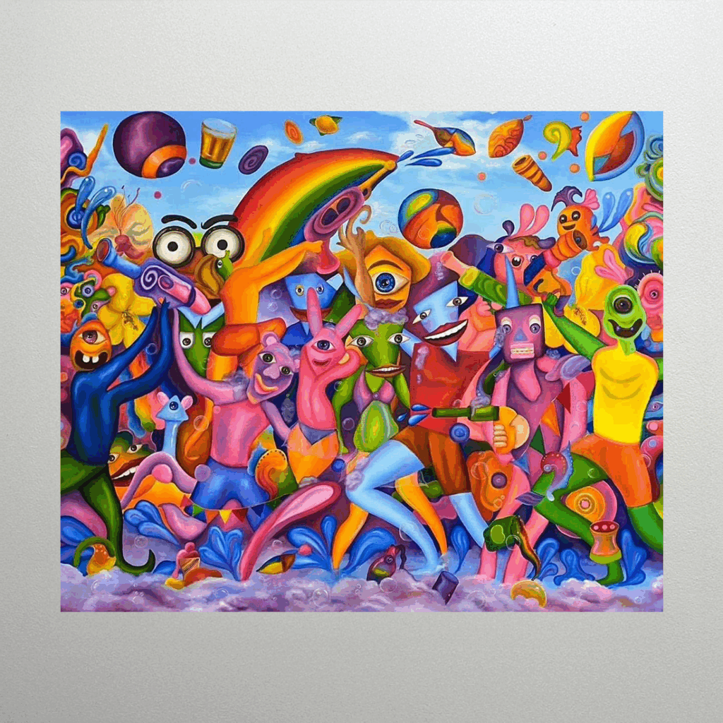 This piece captures the festive atmosphere of Songkran (Thai New Year and Water Festival) using the artist’s signature surreal and intensely colorful style. The canvas is filled with a myriad of colorful monsters or imaginary creatures joyfully engaging in water play.