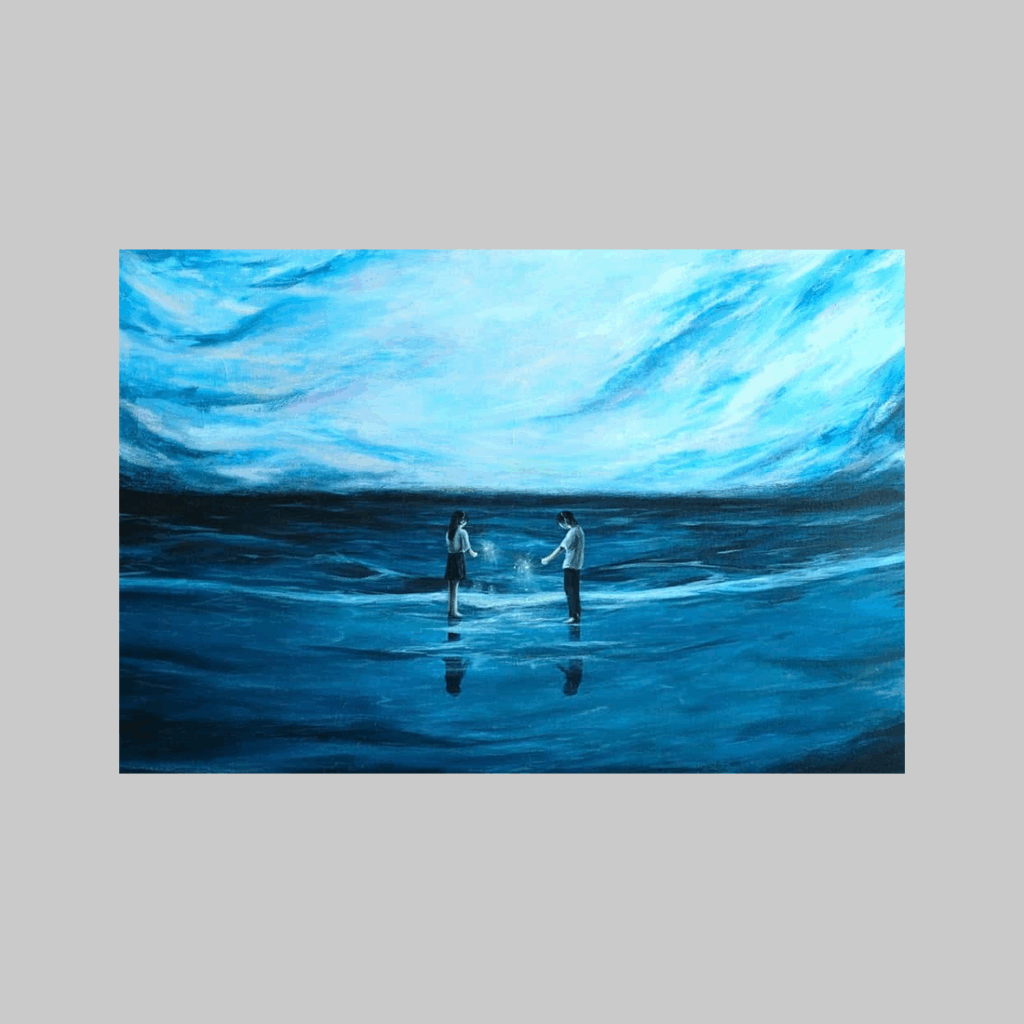The image of a figure standing with open arms in a vast, blue field maximizes the sense of freedom and liberation. This blue field seems to symbolize the figure’s inner world or an idealized space rather than a realistic location. Although yellow petals are falling, the figure stands alone, embracing it all without fear. This expresses a moment of achieving inner peace or finding solace, even in solitude, by sensing an unseen presence (‘someone right next to you,’ as suggested by the title).