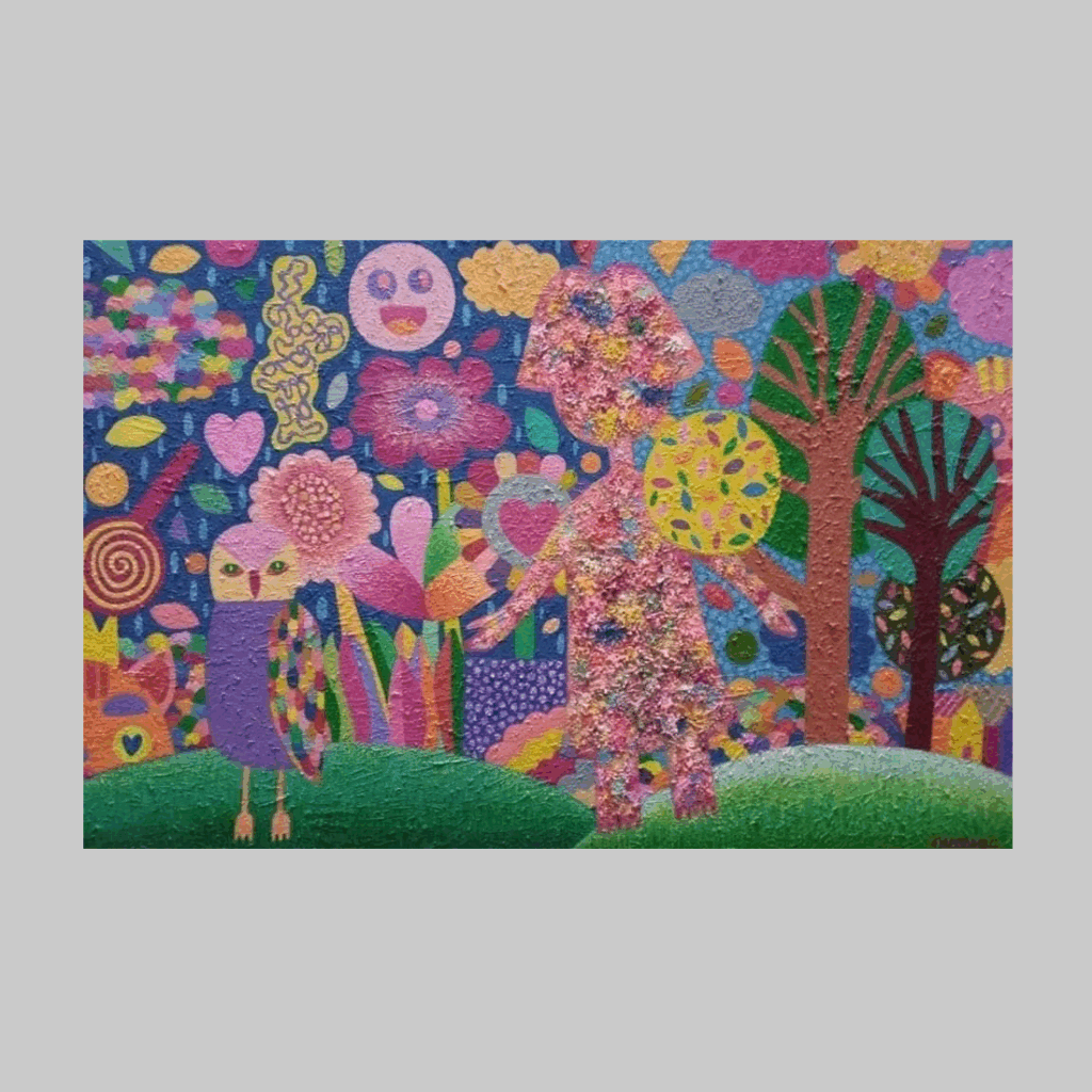 This work depicts a joyful, surreal forest composed of dense colors and patterns. Vibrant flowers, hearts, and smiling face emojis fill the background, while the silhouette of a girl and a purple owl occupy the center. The girl’s form is filled with a petal-like pink texture, visualizing a world of boundless and pure imagination. The owl symbolizes wisdom while also hinting at a companion guiding one through this chaotic yet happy imaginative forest.