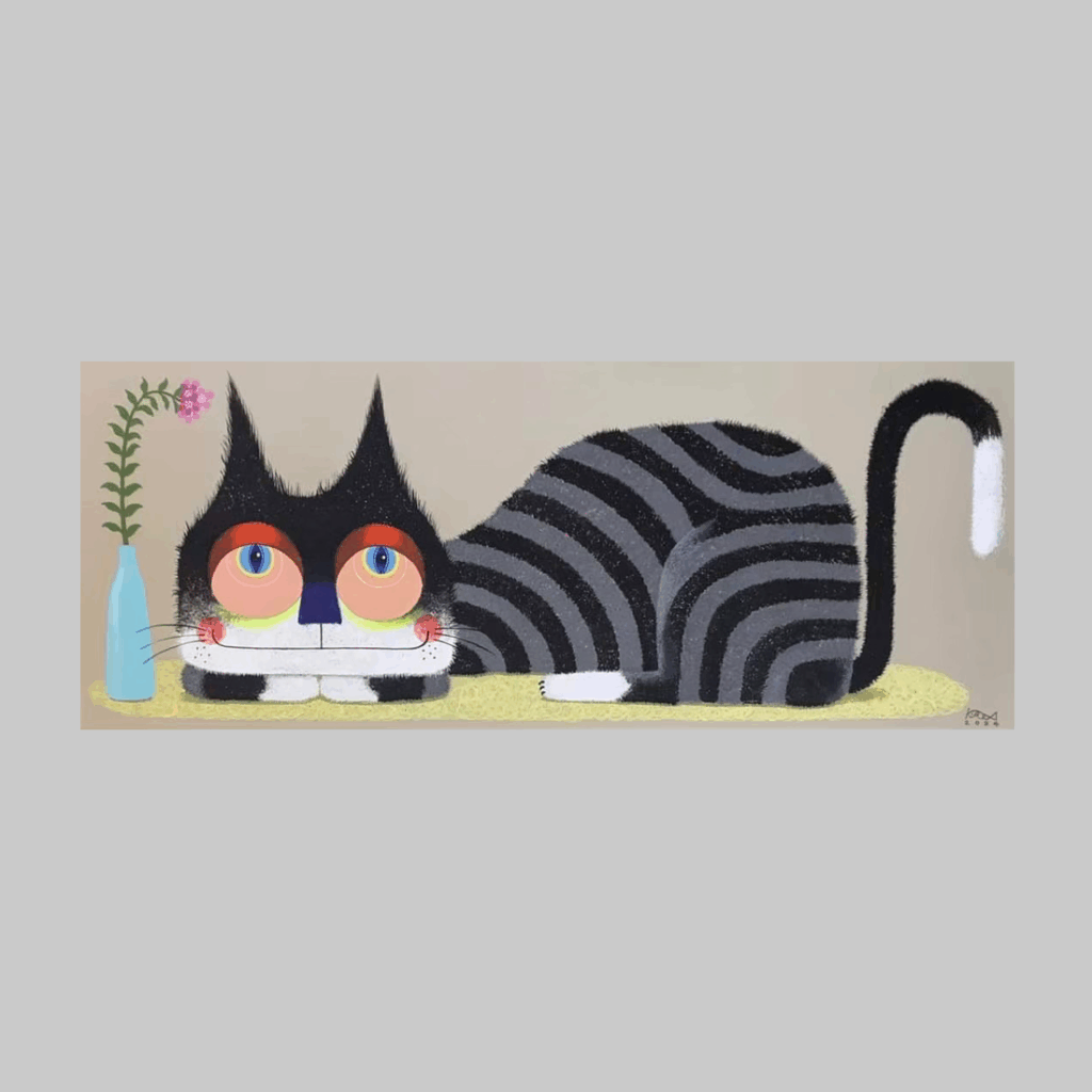 The cat’s large, round eyes, black fur, and exaggerated striped body create a peculiar sense of tension. The small vase placed beside it further emphasizes the cat’s dominant gaze. This work symbolizes the persistent stare that observes a moment and the stubbornness characteristic of a cat.