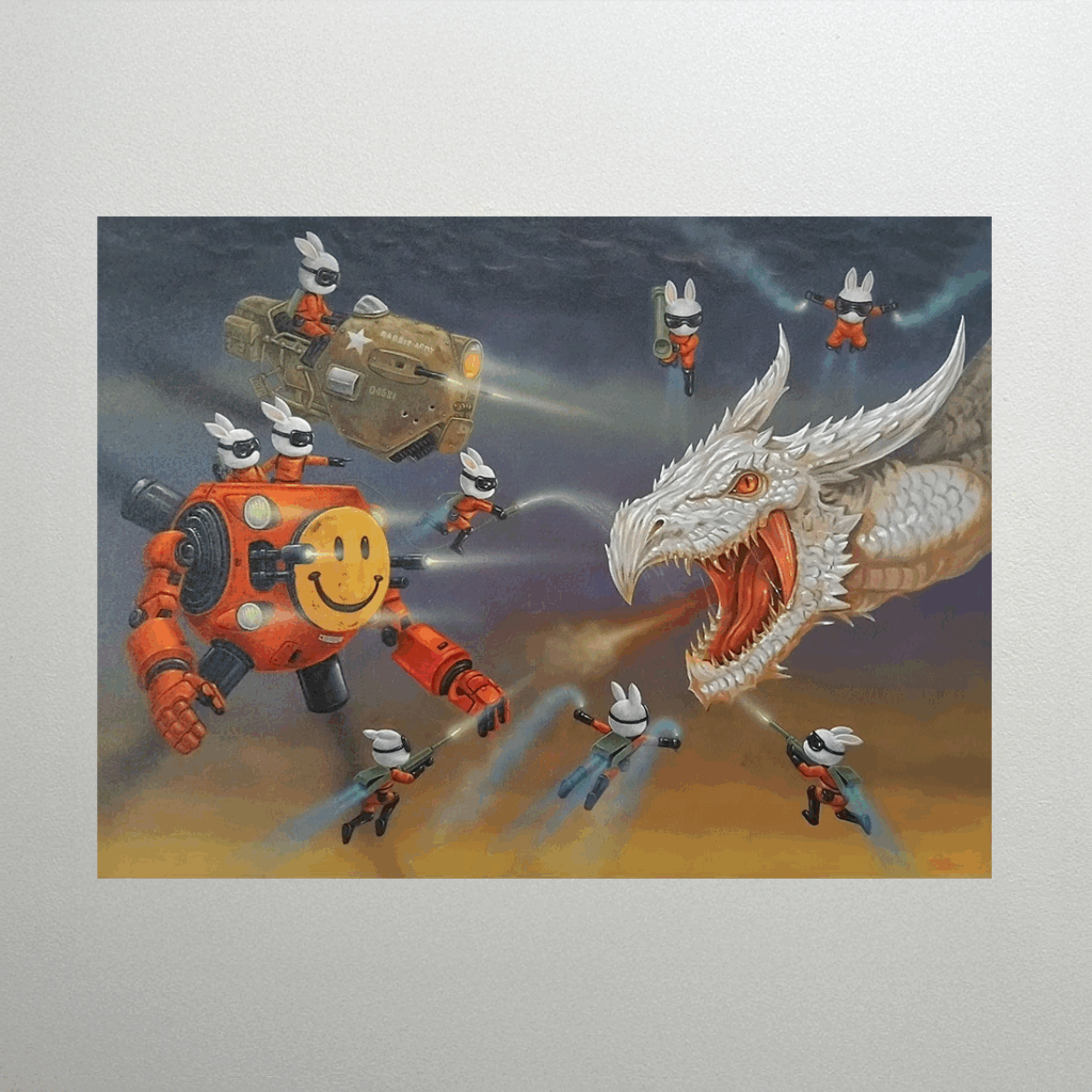 A dynamic aerial battle is depicted between a massive orange robot, controlled by the bunny legion and featuring a giant smiley face, and a fierce white dragon. The confrontation between the weaponized symbol of happiness and the terrifying dragon seems to be a metaphor for the internal struggle against dark monsters like the ‘compulsion to be happy.’ The work playfully explores the ironic nature of war and desire by fusing cute characters with destructive imagery.