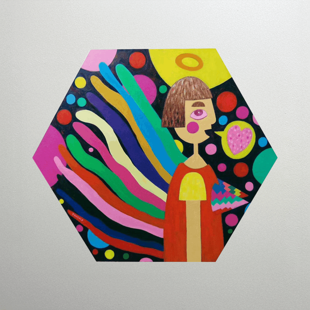 Within a unique hexagonal frame, a simplified figure stands looking out at the audience. Bands of rainbow-like, vibrant colors surge behind the figure, symbolizing hope, positive energy, and creativity. The figure strikes a pose as if communicating a message of love through a heart-shaped speech bubble, serving as a ‘Messenger of Love’ who propagates their colorful energy to the world.