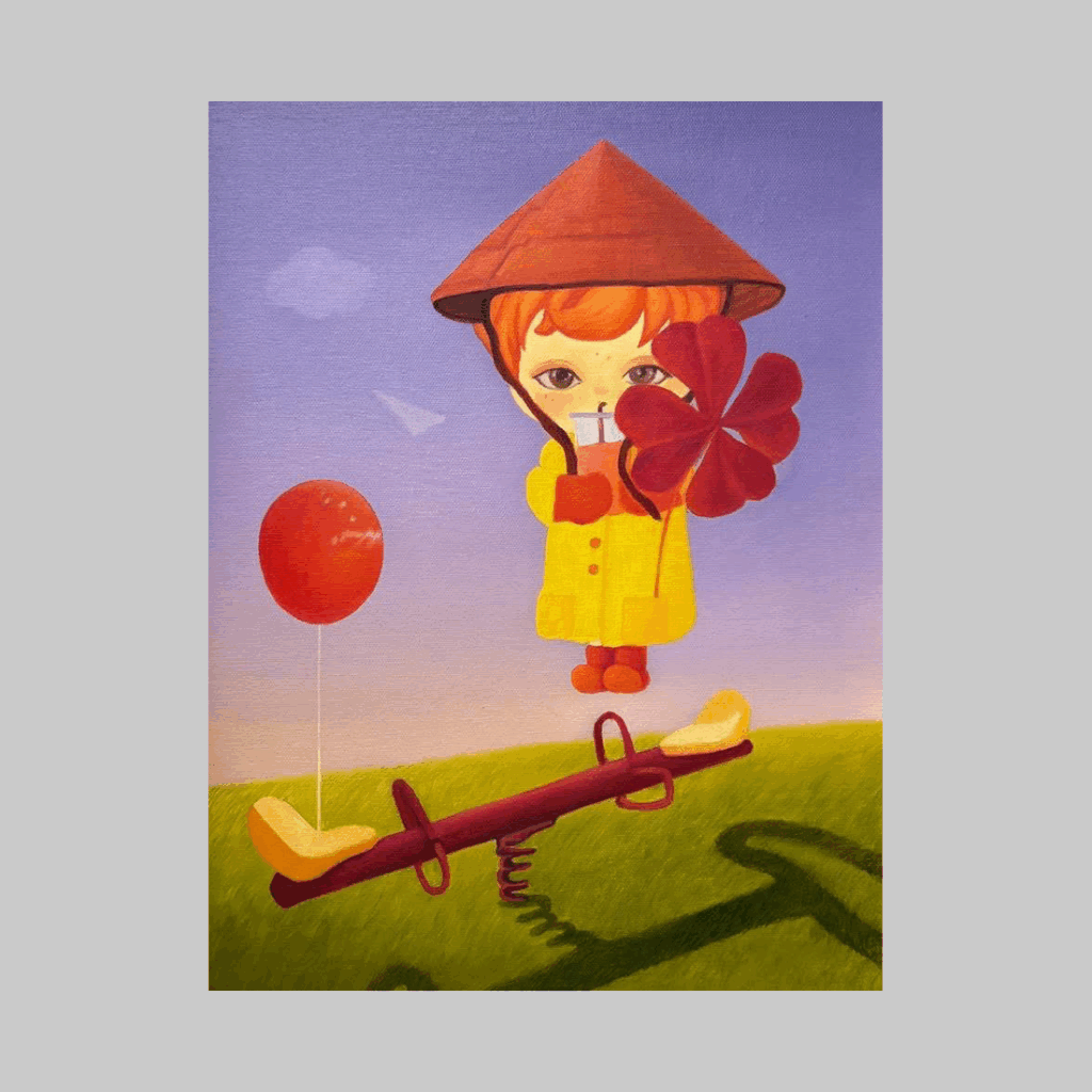 The girl Mirukutii, holding a four-leaf clover and balloons, is a being who can infuse the world with luck through even the smallest gesture. Standing on a perfectly balanced seesaw, her figure seems to be poised on the border between reality and imagination, quietly conveying the power inherent in a pure heart.