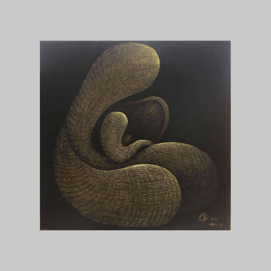 As the title “Mom!” suggests, this work is an abstract expression of the deep and warm bond between a mother and child. The two figures, rendered in a unique texture that resembles woven straw or wood, embrace each other, forming a secure barrier of protection. Illuminated softly against a dark background, the luminous forms quietly and solemnly depict the fundamental, unchanging power of maternal love.