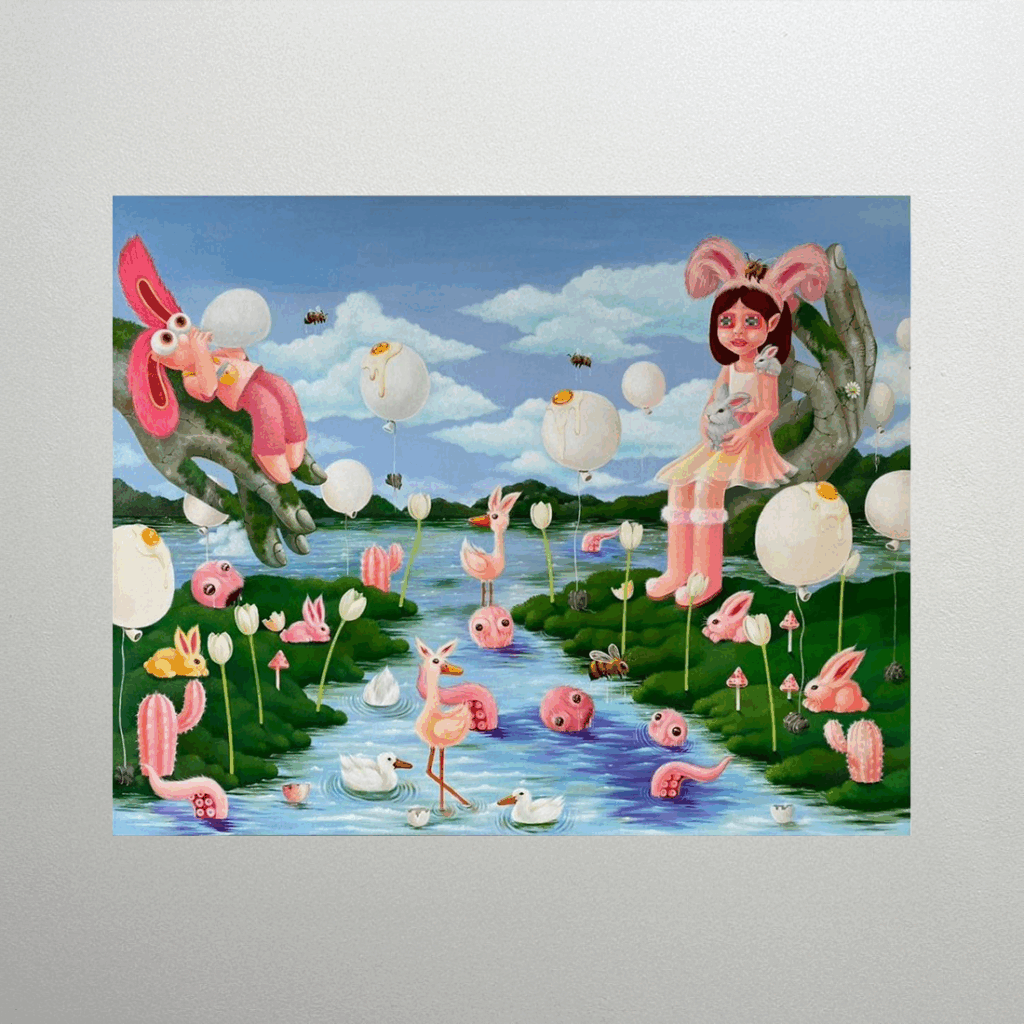 This piece presents a surreal space reminiscent of ‘Alice in Wonderland.’ While featuring beautiful elements like pink and blue tiled floors and arched windows opening to a blue sky, it juxtaposes these with bizarre and violent images, such as severed legs and arms, and rabbits floating in a tub. It seems to metaphorically represent an inner state that appears peaceful on the surface but is filled with hidden chaos and desire.