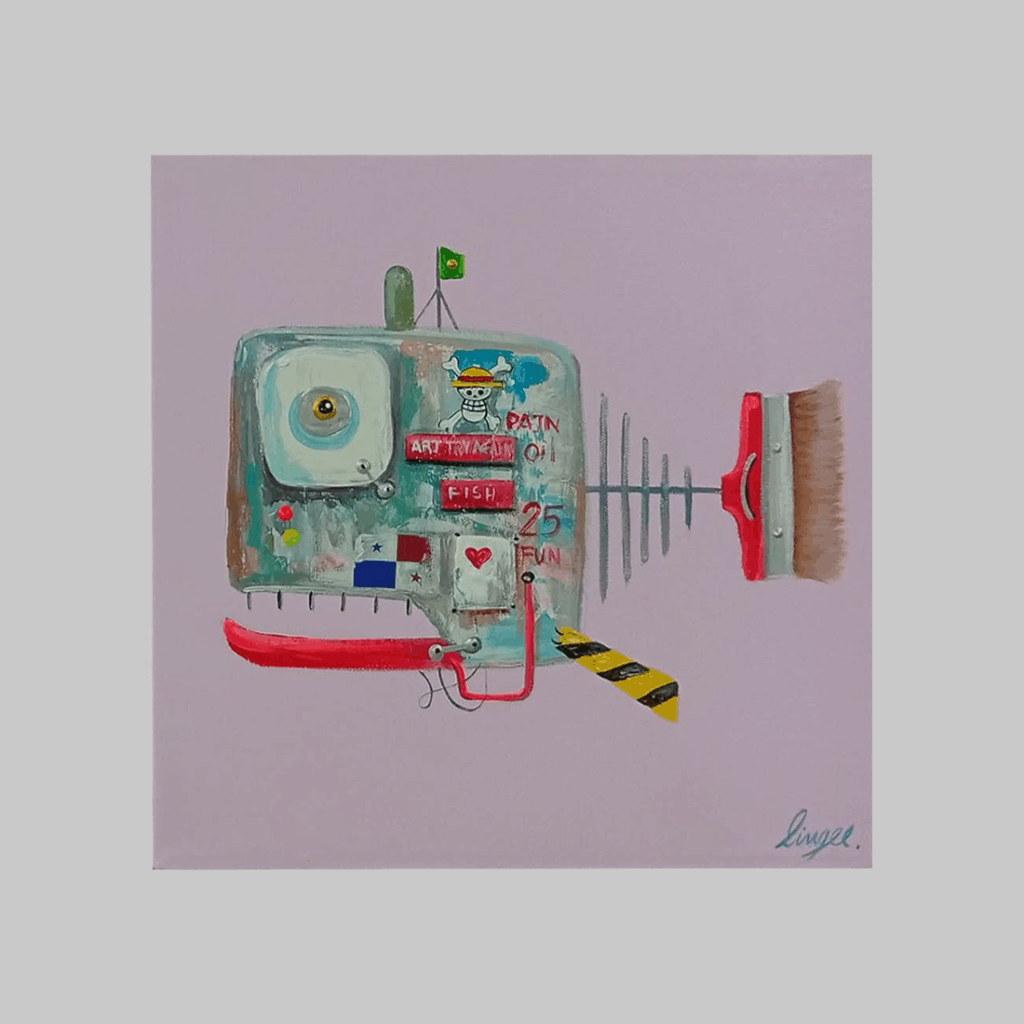 This artwork depicts a square-shaped fish adorned with a skull and a pirate flag, symbols of a pirate captain.  The phrase ‘ART TRY AGAIN’ inscribed on the body seems to represent the artist’s spirit of not fearing challenge and failure, while the tail, stylized as a paintbrush, illustrates a passionate commitment to art.