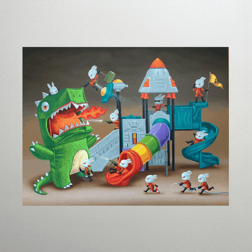 A peaceful playground is transformed into a battlefield. The bunny legion establishes positions on slides, tunnels, and rocket-shaped structures, while a monster seemingly wearing a dinosaur costume attacks with fire. The juxtaposition of the space of pure play and destructive combat shows, in a humorous yet uncanny way, how childhood play expands into the conflicts and competition of real life.
